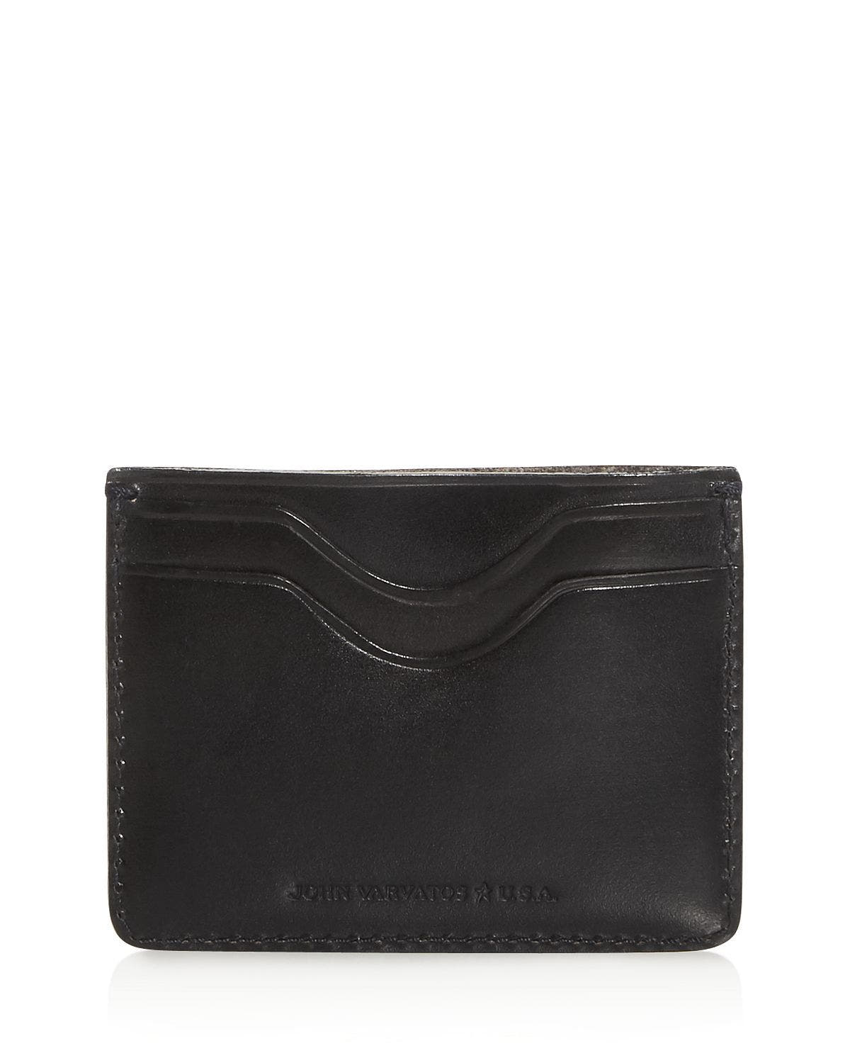 - Dimensions: 4"w x 3"h; four exterior card slots one interior slip compartment; embossed logo at front; unlined; leather; made in india
