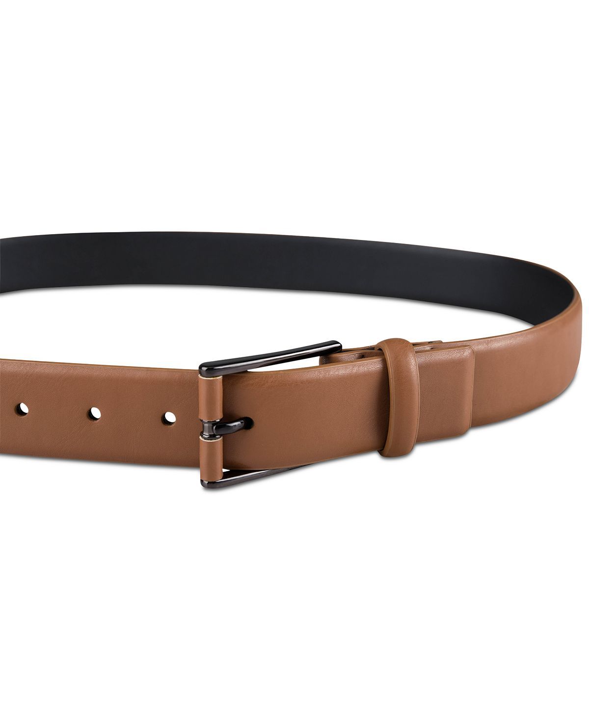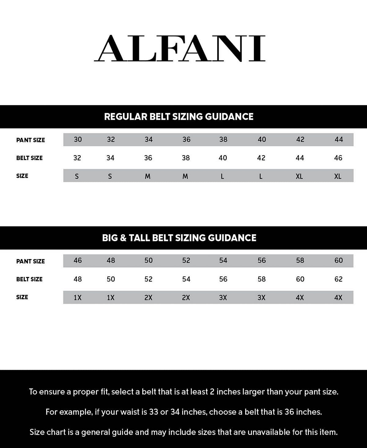 Bring sleek contemporary style and all day comfort to your polished look with the matte black hardware and Alfatech stretch technology of this faux-leather dress belt from Alfani.Approx. length: 39-1/2"; Approx. width: 1-1/4" Matte black harness buckle with faux-leather wrapped bar; blunt tip; seven holes for an adjustable fit; For best fit order a size 2" larger than your waist size. Alpha size info: Small (30"- 32") Medium (34"- 36") Large (38"- 40") Extra Large (42"- 44") ; Polyurethane/polyester; Spot clean; Imported