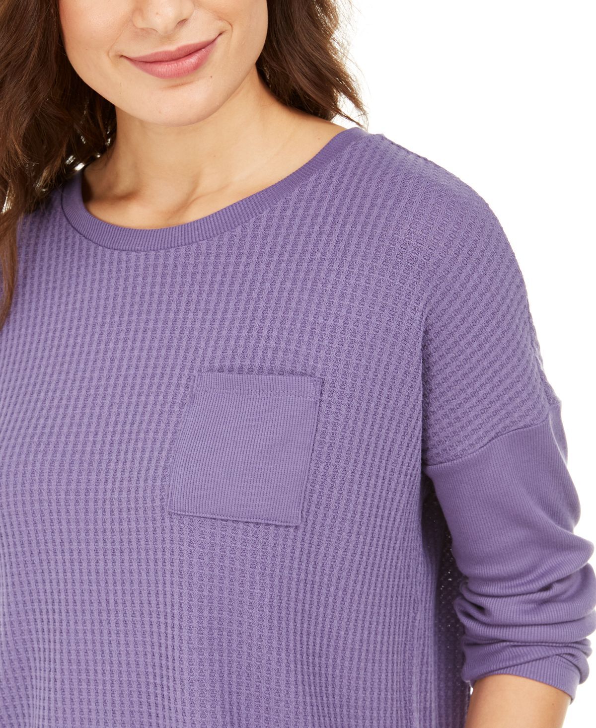 Classic thermal and ribbed styles combine on this cozy pajama top by Alfani.Matching pants sold under WebID 10220433; Length: Hits at waist; approx. 23-1/2" long; Special Features: Pocket at left chest; ribbed sleeves; Neckline: Scoop neck; Closure: Pullover styling; Sleeve Length: Long sleeves; Polyester/rayon/spandex; Machine washable; Imported