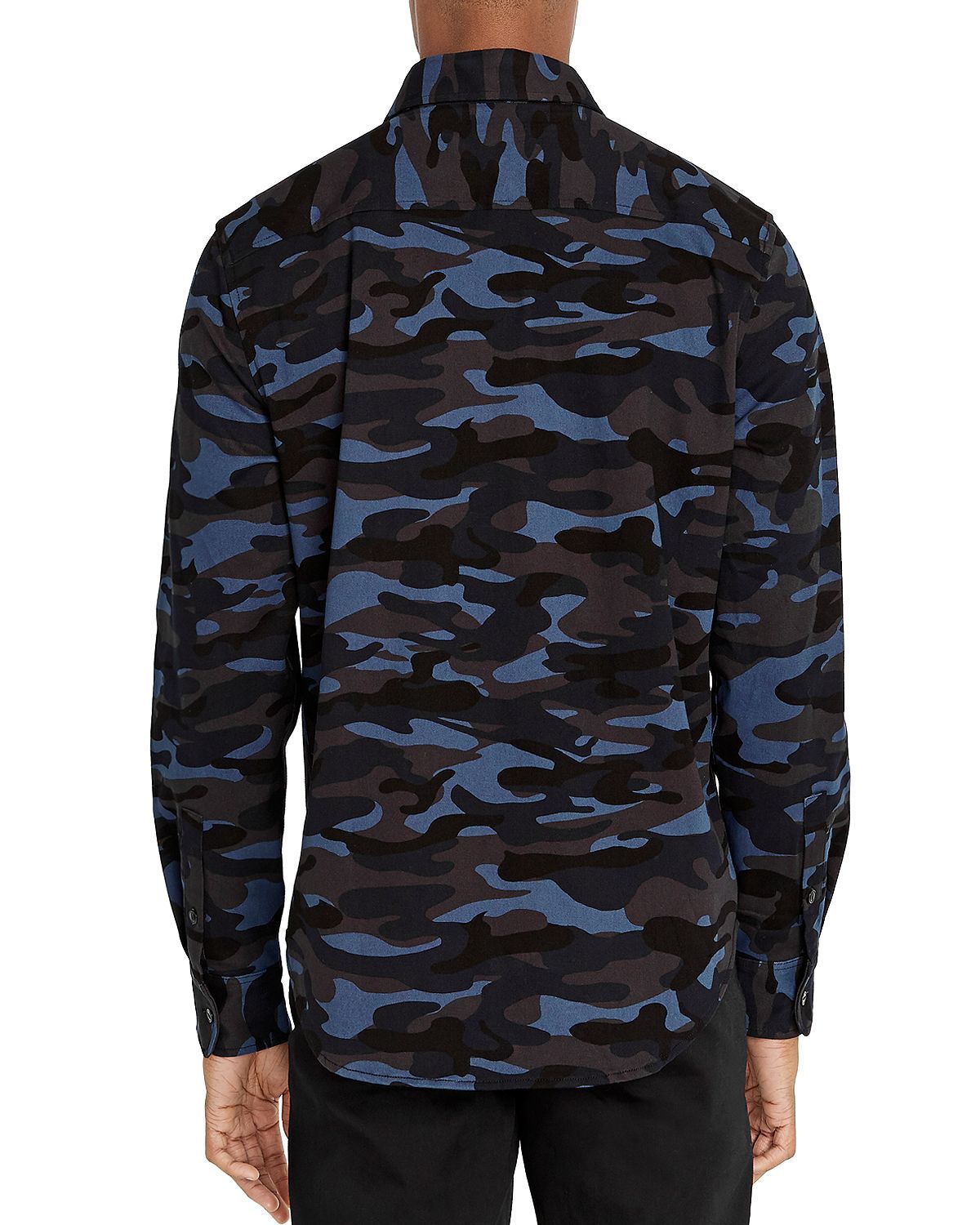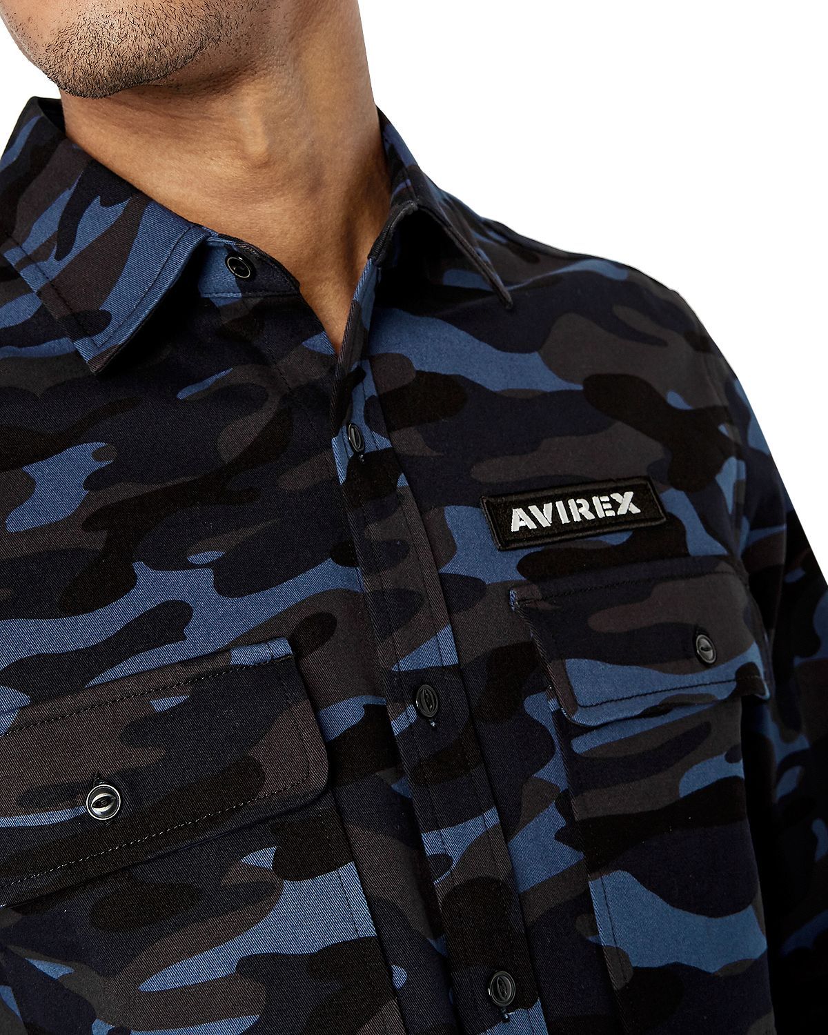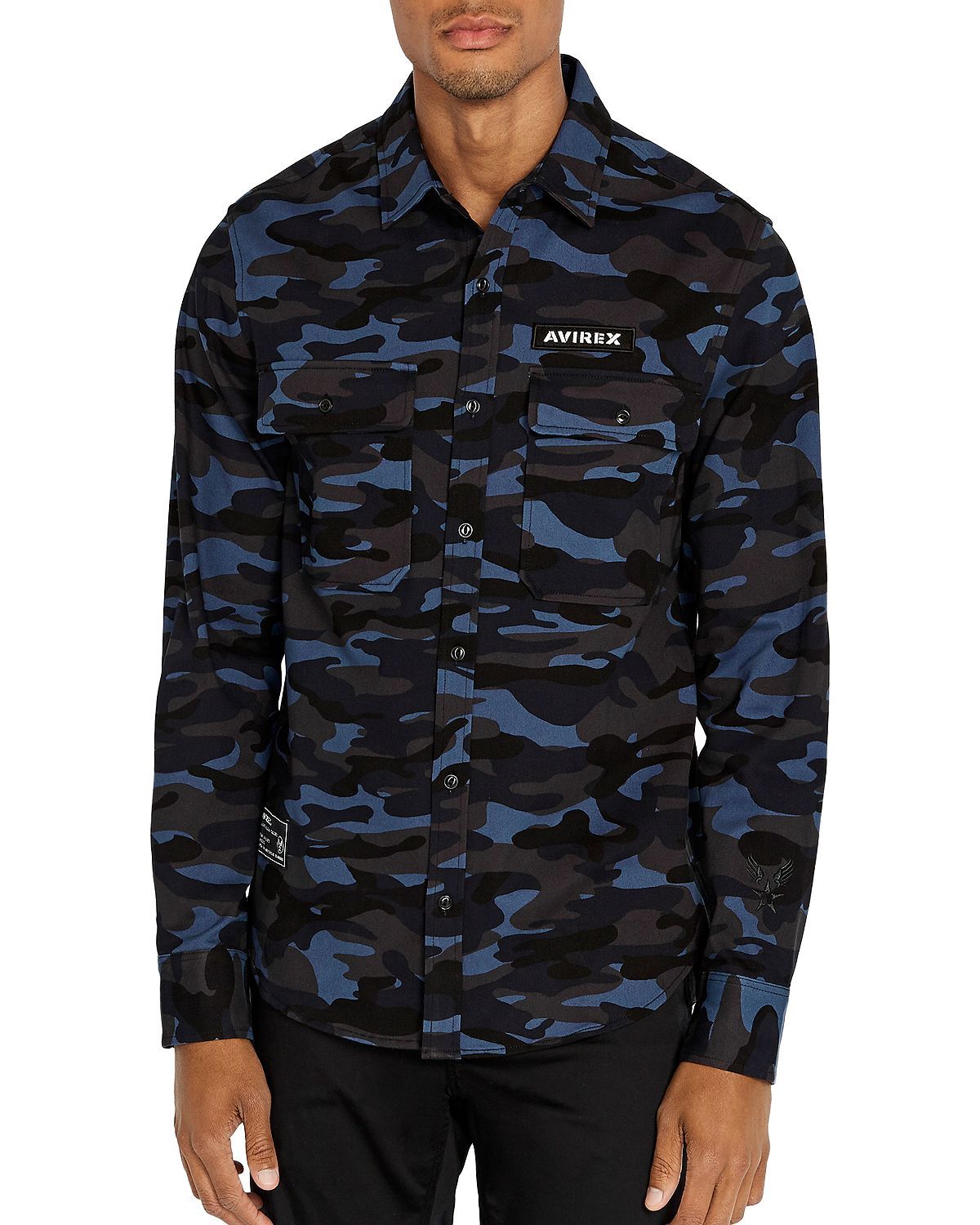 Avirex Camo Slim Fit ShirtFits true to size order your normal size; Designed for a slim fit; Model measurements: 6'2" height 38" chest 30" waist 34" inseam wearing a size medium/32/48EU; Spread collar; Front button placket; Long sleeves with button barrel cuffs; Two chest button flap pockets; Chest and hem logo patches; Shirttail hem; Back yoke; 97% cotton/3% spandex; Machine wash; Imported