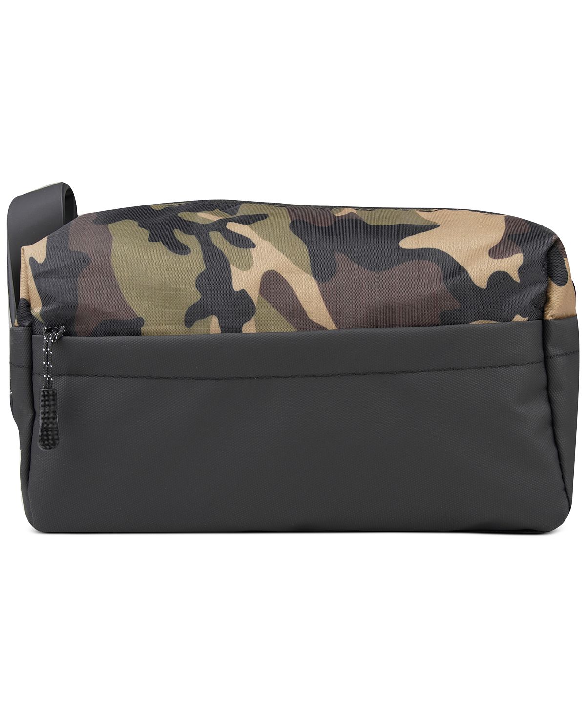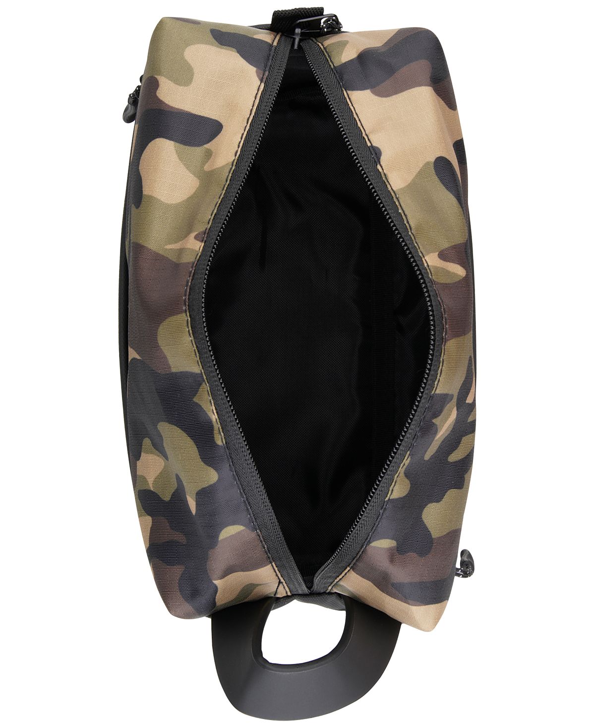 A rugged contemporary look in on-the-go organization this Bespoke dopp kit is colorblocked with a camo print. It's water-resistant to protect your gear.Approx. exterior dimensions: 10"L x 6"W x 4"H Exterior: water-resistant; zip pocket at front; Handles: loop handle at side; Polyester; coating: polyurethane; Spot clean only; Imported