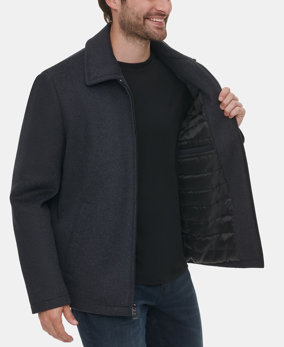 For a warm feel without the bulk throw on this modern styled Calvin Klein jacket. Its rich wool blend and streamlined styling make it the essential cold weather piece for the fashionable gentleman.Sits at waist; Regular fit; Zip-through collar; Zip-front; Single entry hand pockets; Chest pocket with zipper closure; Interior pocket; Fully lined; Open bottom; Inner channel quilt lining; CK branding below neckline; Shell: wool/polyester/acrylic/other fibers; lining: polyester; Dry clean; Imported