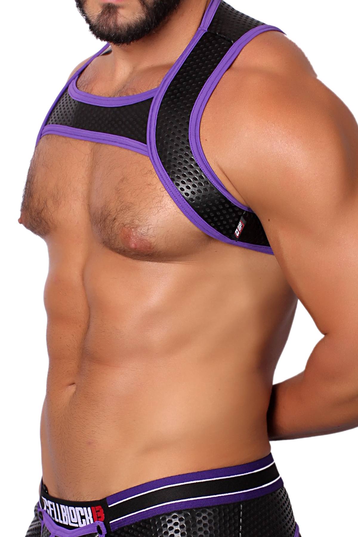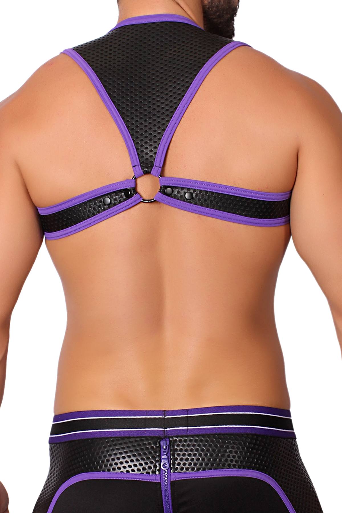 - This upper body harness is made of high quality perforated polyurethane against solid black polyester and features piping in a popular fetish color.
