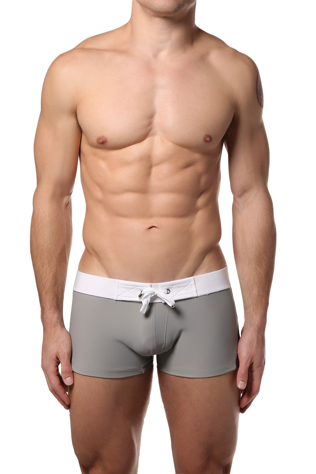 - Sporty low-rise swim trunkBody-hugging square cutClassic pouch with slight contour1.5" white contrast waistband White drawstring with silver eyelets for closer fitGrey, green, and purple paneled nylon fabricGrey contrast stitching Front lined Imported