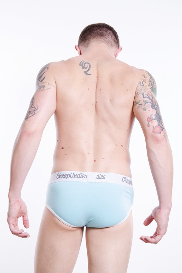 - Brand: CheapUndies Classic brief fit Contoured pouch for enhancement White piping accent framing pouch and finish at hemSky blue 4-way stretch cotton fabric throughoutWhite elastic logo waistband with grey font Fabric: 95% Cotton 5% Elastane Imported