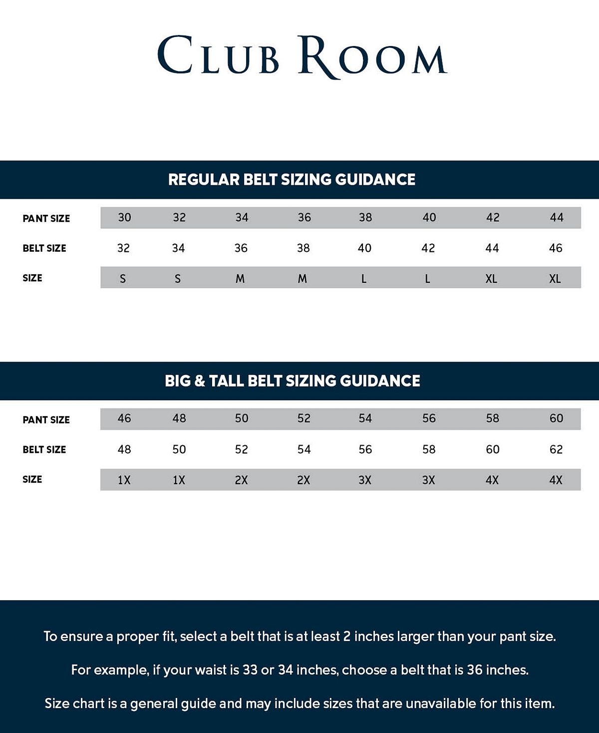 Give your outfit a little something extra. This leather braided belt from Club Room is just the thing for standout style.Belt sizes run smaller order one size larger than actual waist size; Braided belt; Multiple hole adjustment for a comfort fit; For best fit shop belt 2 inches larger than your pant size. If pant size is 38" shop belt size 40".; Leather fibers/non-leather substances; Imported