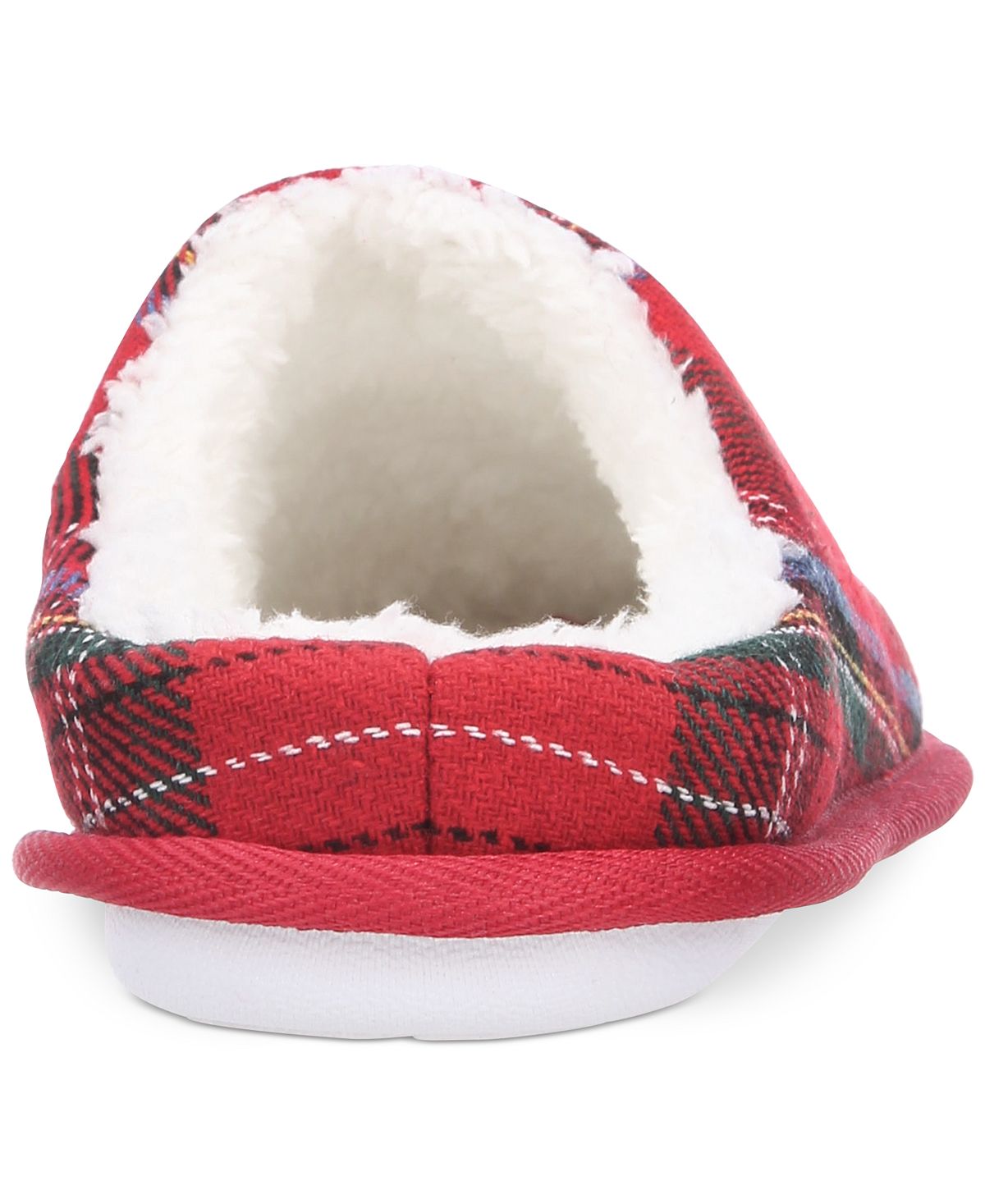 Keep cozy when home with the plush feel of these festive plaid slippers by Club Room.Round-toe slip-on slippers; Plaid patterning; Polyester/acrylic/nylon/cotton/wool upper; polyester lining; TPR/textile outsole; Machine washable; Imported
