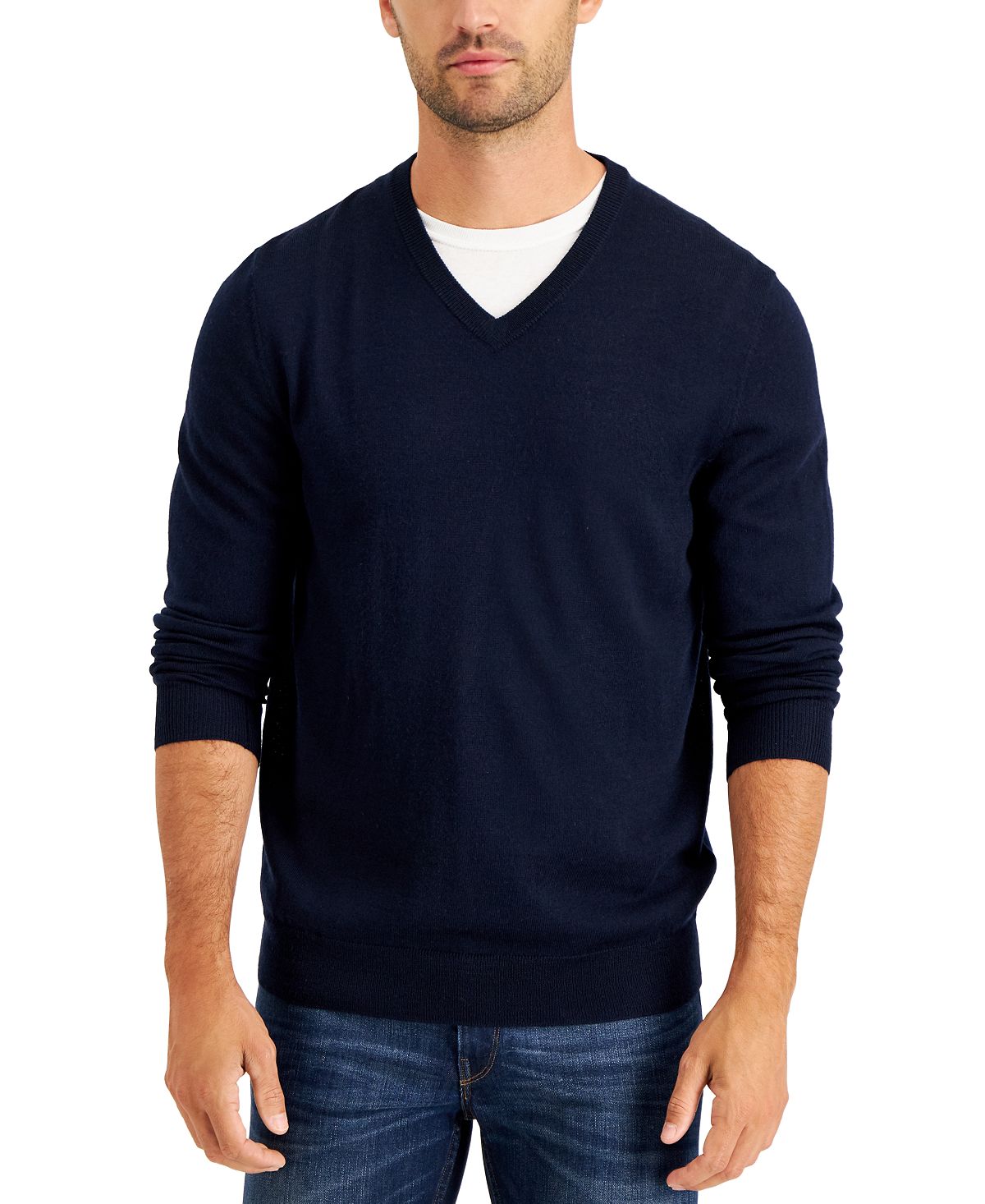 Club Room Solid V-neck Merino Wool Blend Sweater Navy Blue