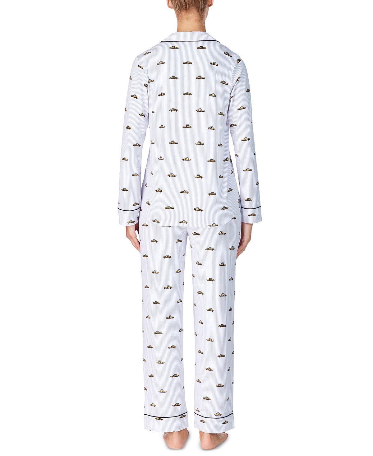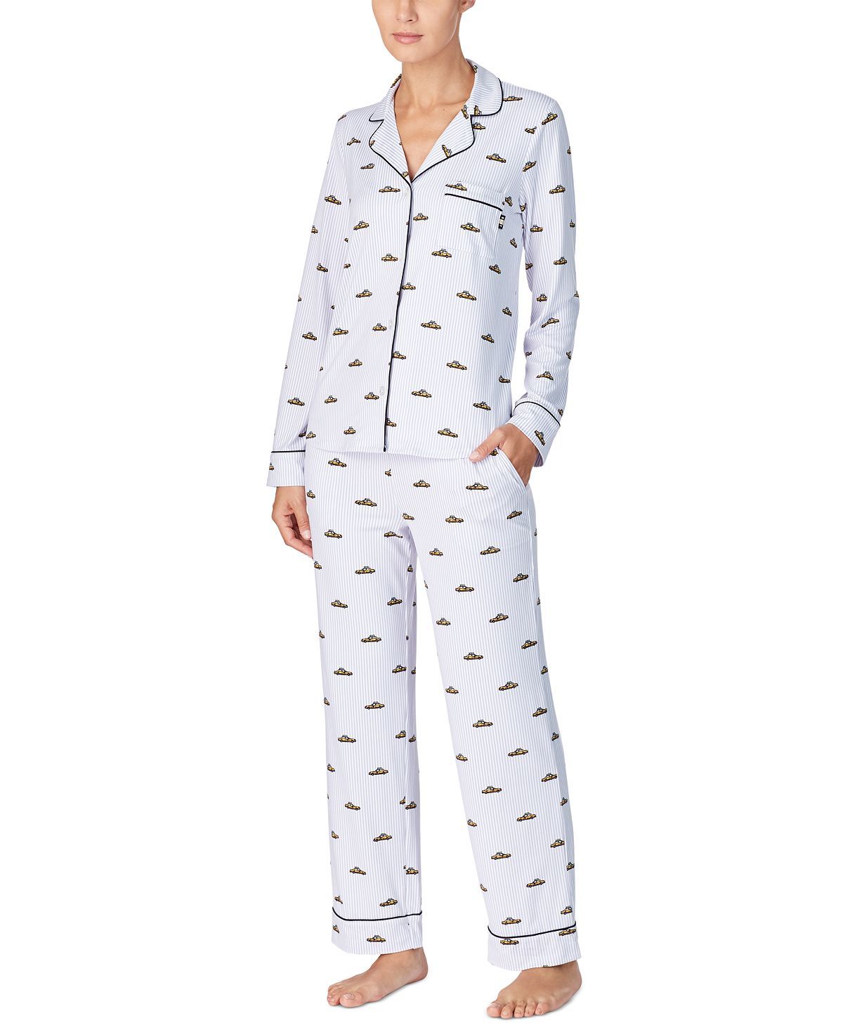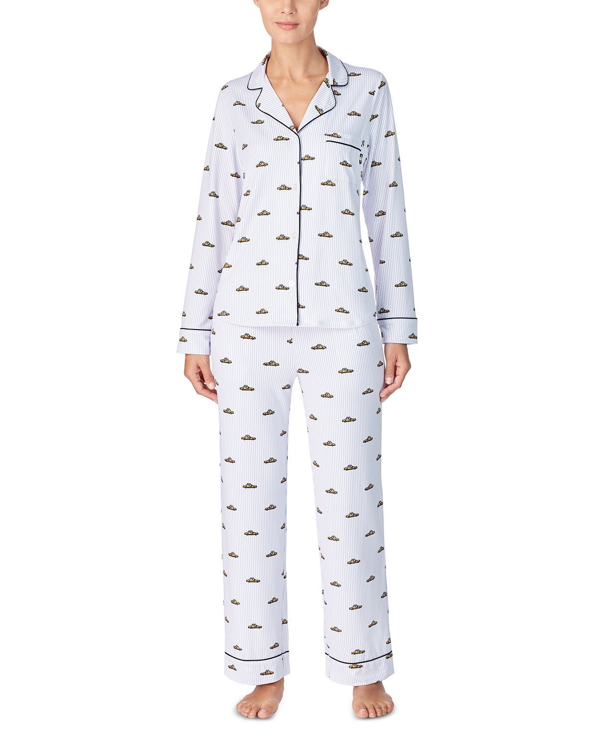 Stylish and comfy add chicness to your night time routine with this printed pajamas set by DKNY.Top: hits at hip; jersey fabric; pocket at left chest with logo tab; piping trim; notched collar; button-front closures; long sleeves; Bottom: inseam approx. 29-1/2"; jersey fabric; two pockets at sides; elastic waist with drawstring; Polyester/spandex; Machine washable; Imported