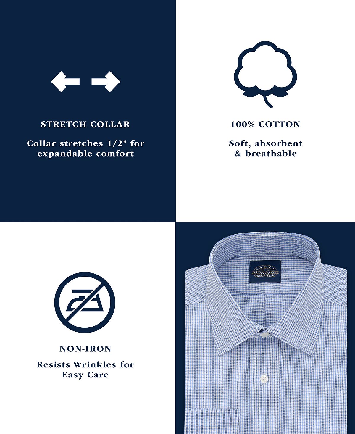 A point collar and non-iron design make this dress shirt from Eagle an essential for smart sophisticated style.Button-down collar expands up to 1/2"; Non-iron; Point collar; Button-cuffs; Cotton; Machine washable; Imported