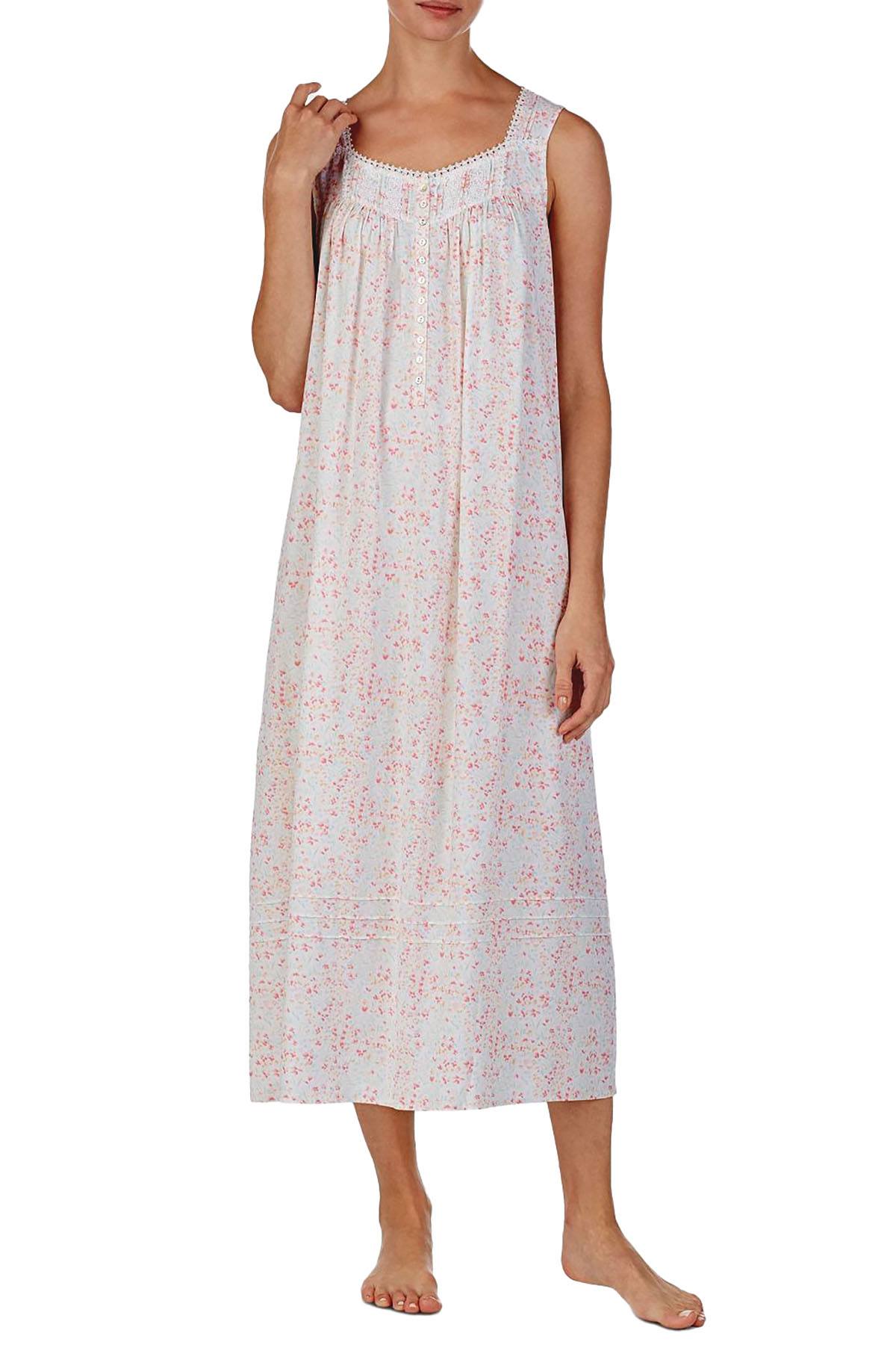 Delicate florals printed on a flowy silhouette this airy Eileen West ballet-length nightgown is finished with the fine edge of Venise lace trim. Length: Hits at mid-calf: approx. 49.75" long. Special Features: Front yoke with pintucked and eyelet trim. ruching below front and back yokes. pintucking above hemline. Closure: Button-front closure with Akoya shell buttons. Neckline: Queen Anne neckline with Venise lace trim. Sleeve Length: Sleeveless. Rayon. Machine washable. Imported.
