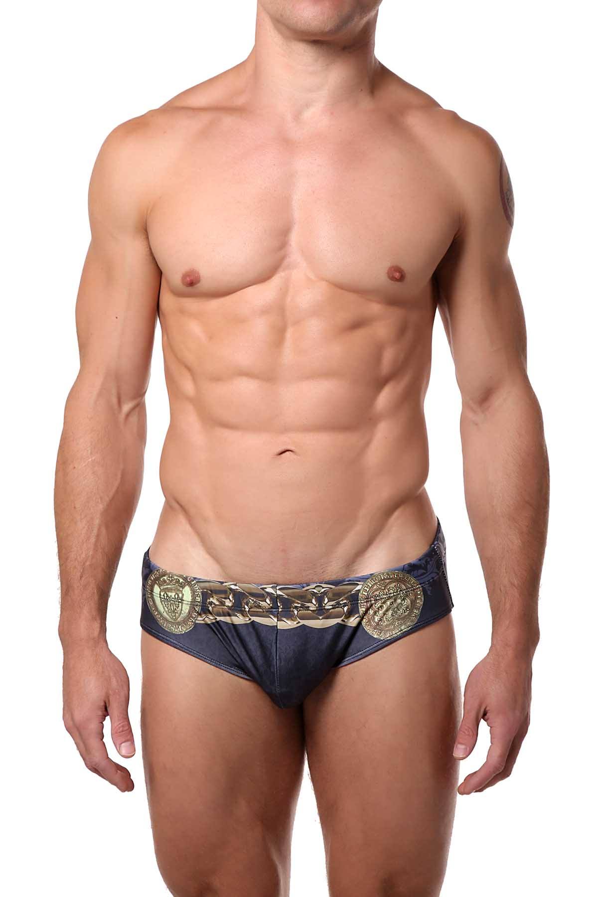- Details: Gold chain print; Slim-fit swim brief; Low-rise waistline; Nylon blend fabric; Signature logo tag