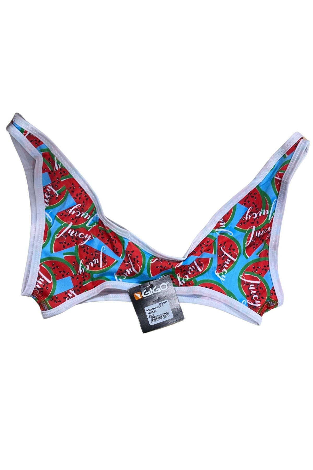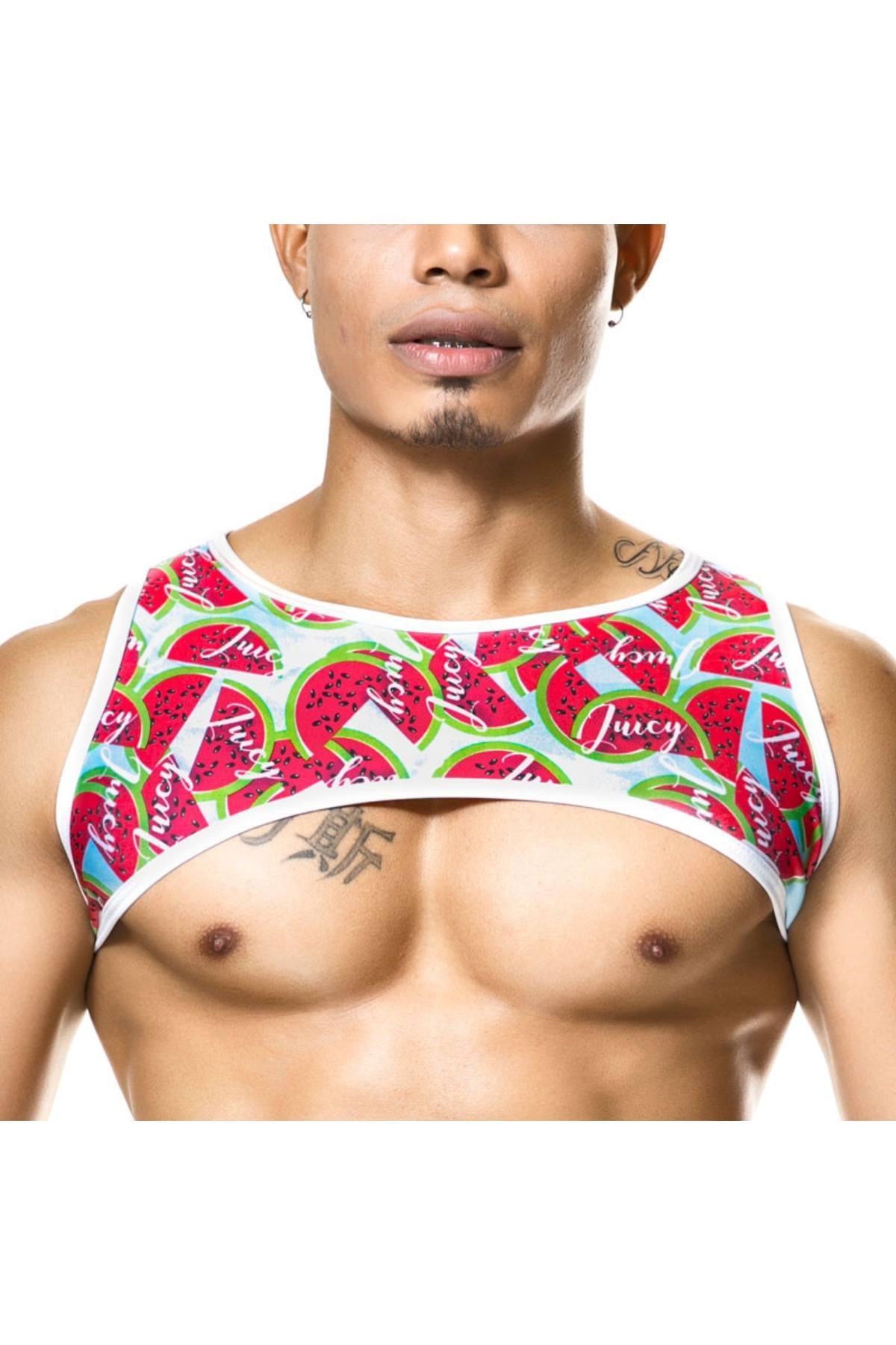 Get ready to make a splash with the Gigo Juicy Harness. This sexy piece is designed to turn heads and show off your best assets. Featuring a bold all-over watermelon print with the word “JUICY” scattered throughout, this harness is the ultimate statement of playful seduction.