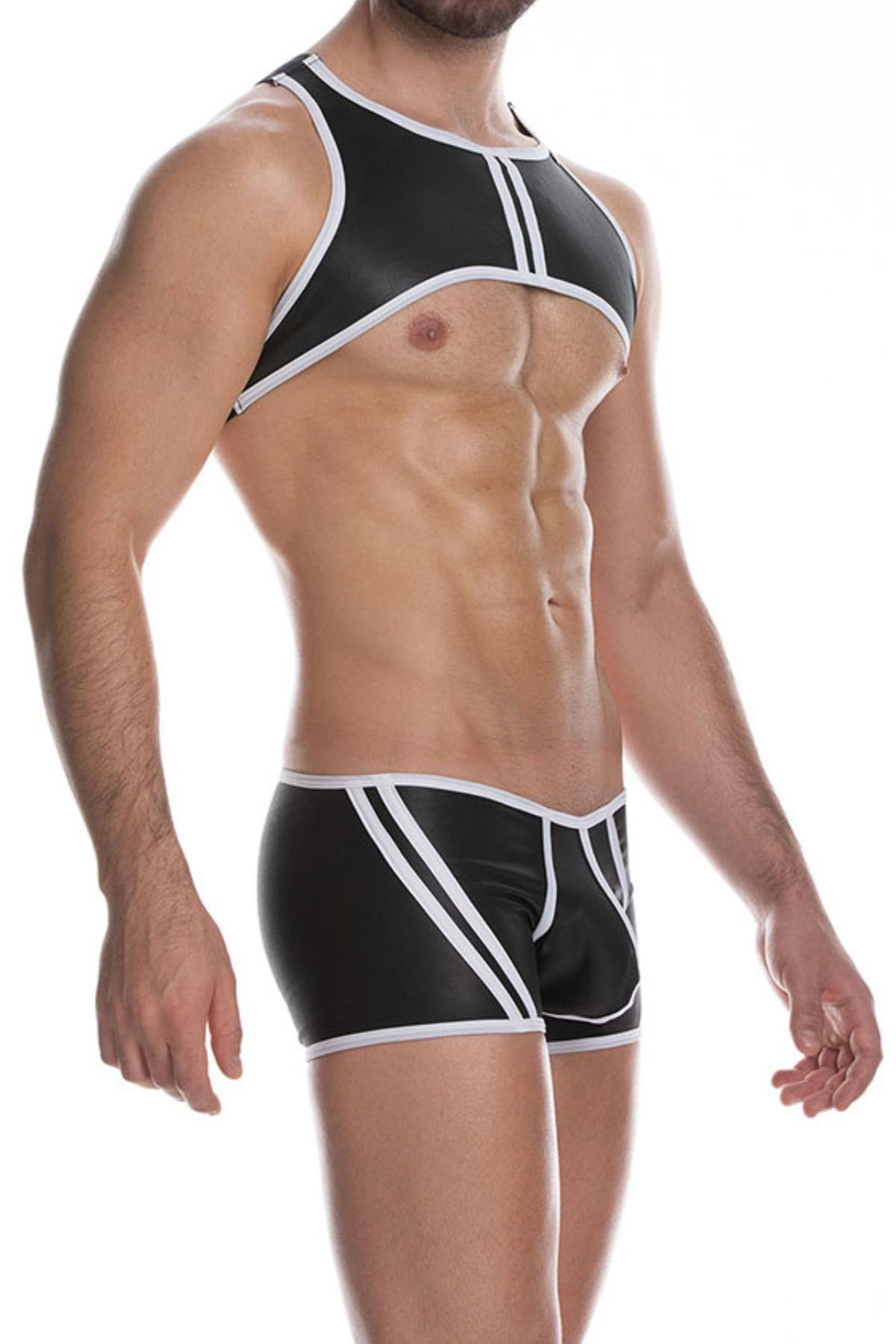 Unleash your inner charm with the Gigo White Latin Harness. This striking harness, primarily black with bold white accent stripes down the center of the chest and white trim, is designed to showcase your physique in the most seductive way. The pleather look, combined with a comfortable blend of 75.79% Nylon and 24.21% Spandex, ensures you look and feel fantastic.