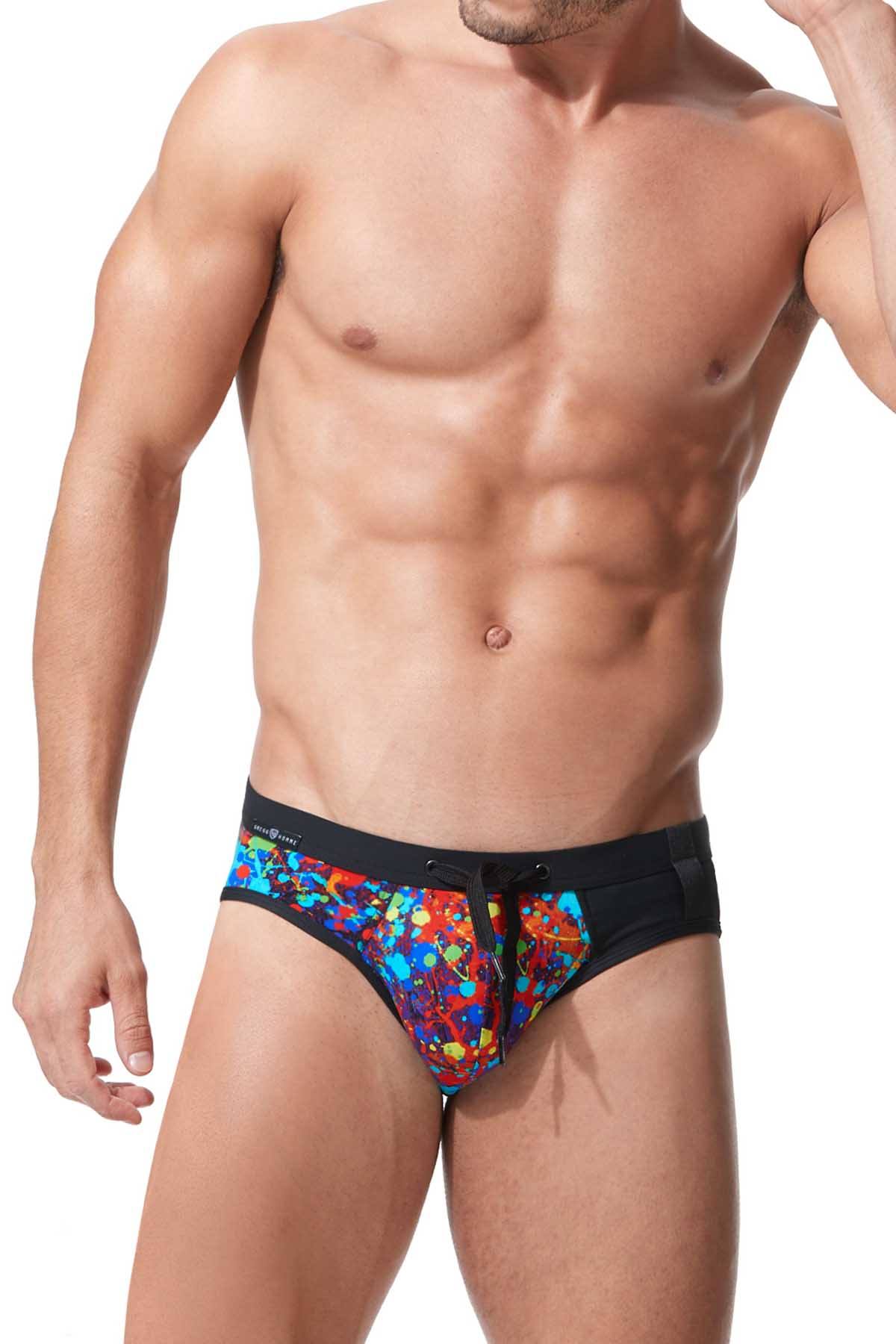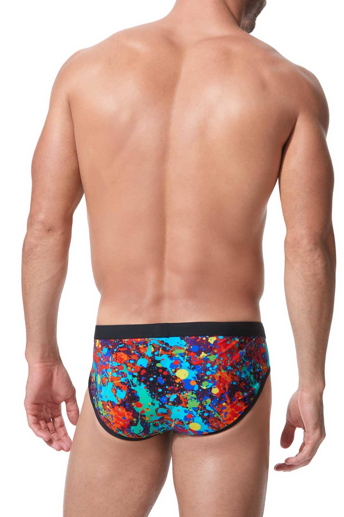 Featuring a bold and brightly colored paint splatter print, the Flamed swim brief by Gregg Homme offers a standout look that will get you noticed. It's made of ultra-soft technical fabric with a matte finish and includes lining inside the pouch, contrast panels and trim, twill tape at the side, and a covered elastic waistband with adjustable front drawstrings.