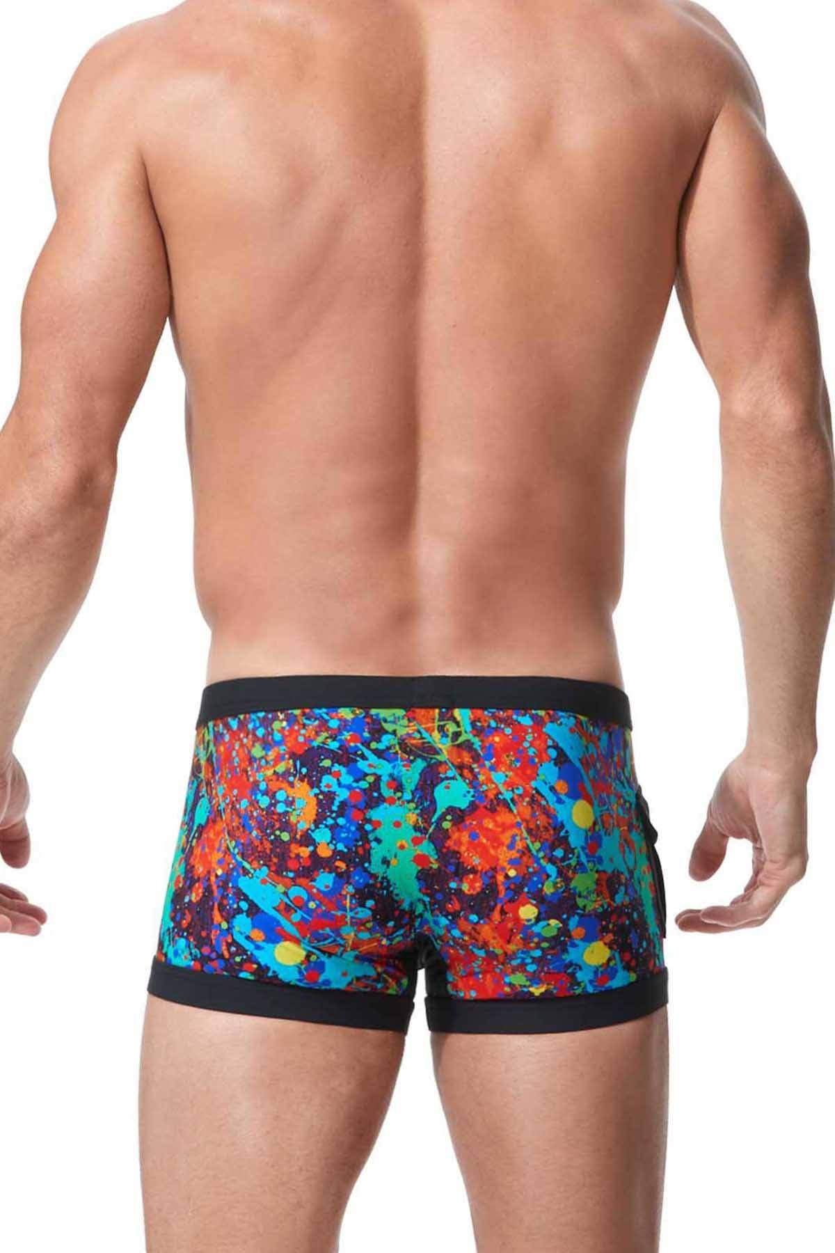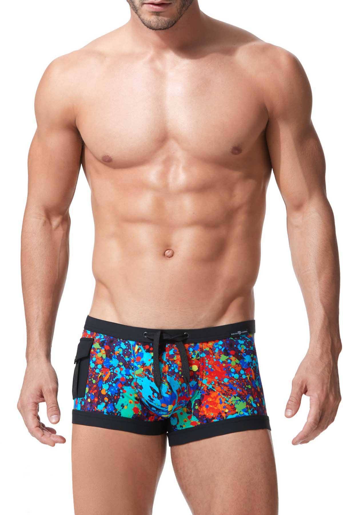 - Featuring a bold and brightly colored paint splatter print, the Flamed swim trunk by Gregg Homme offers a standout look that will get you noticed.