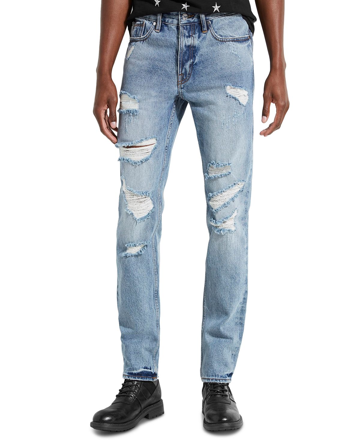 Keep current with these GUESS jeans in all cotton with a faded wash and extensive rips.Zip fly with button closure; belt loops; Extensive rips; whiskering and fading; 100% cotton; Machine washable; Imported