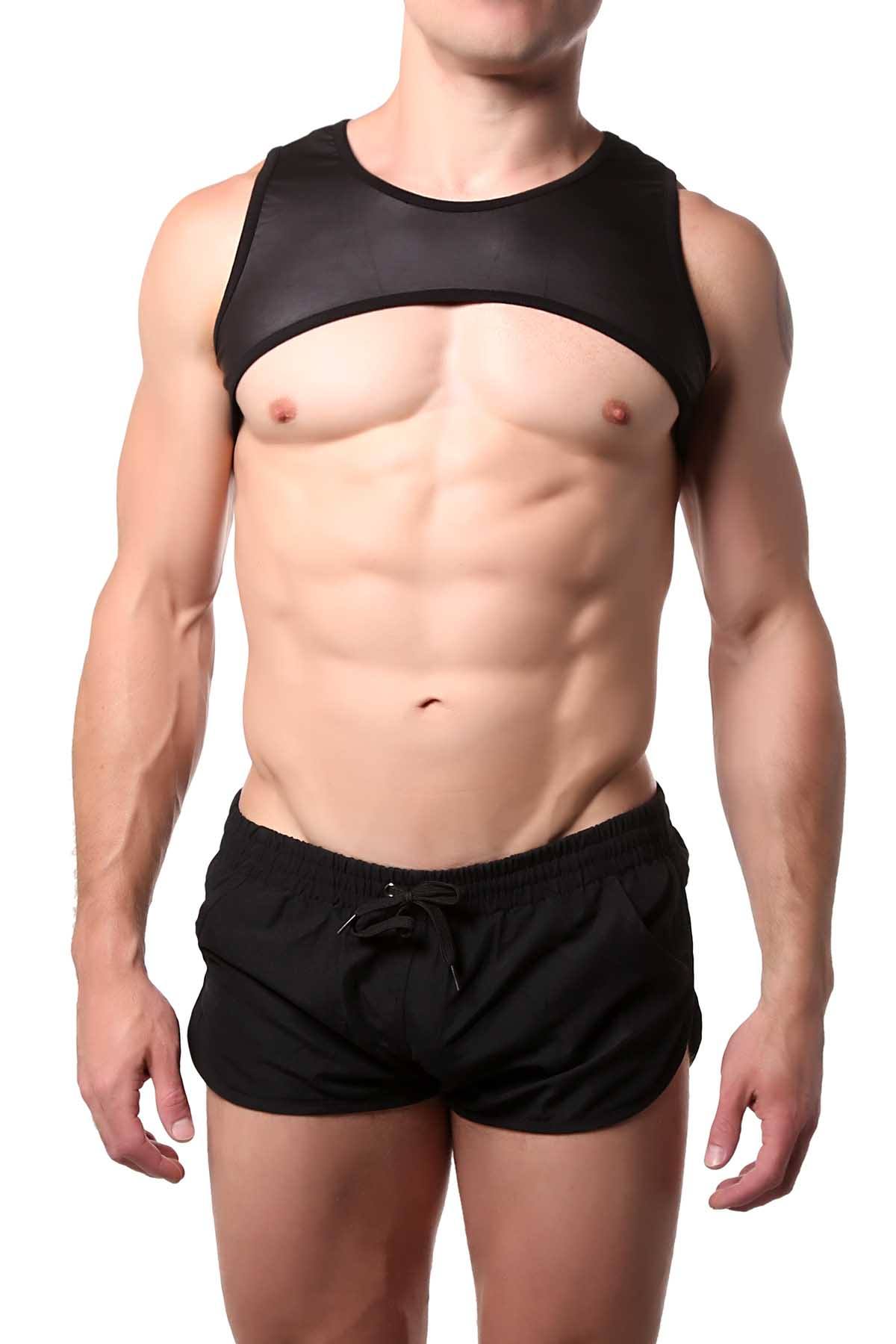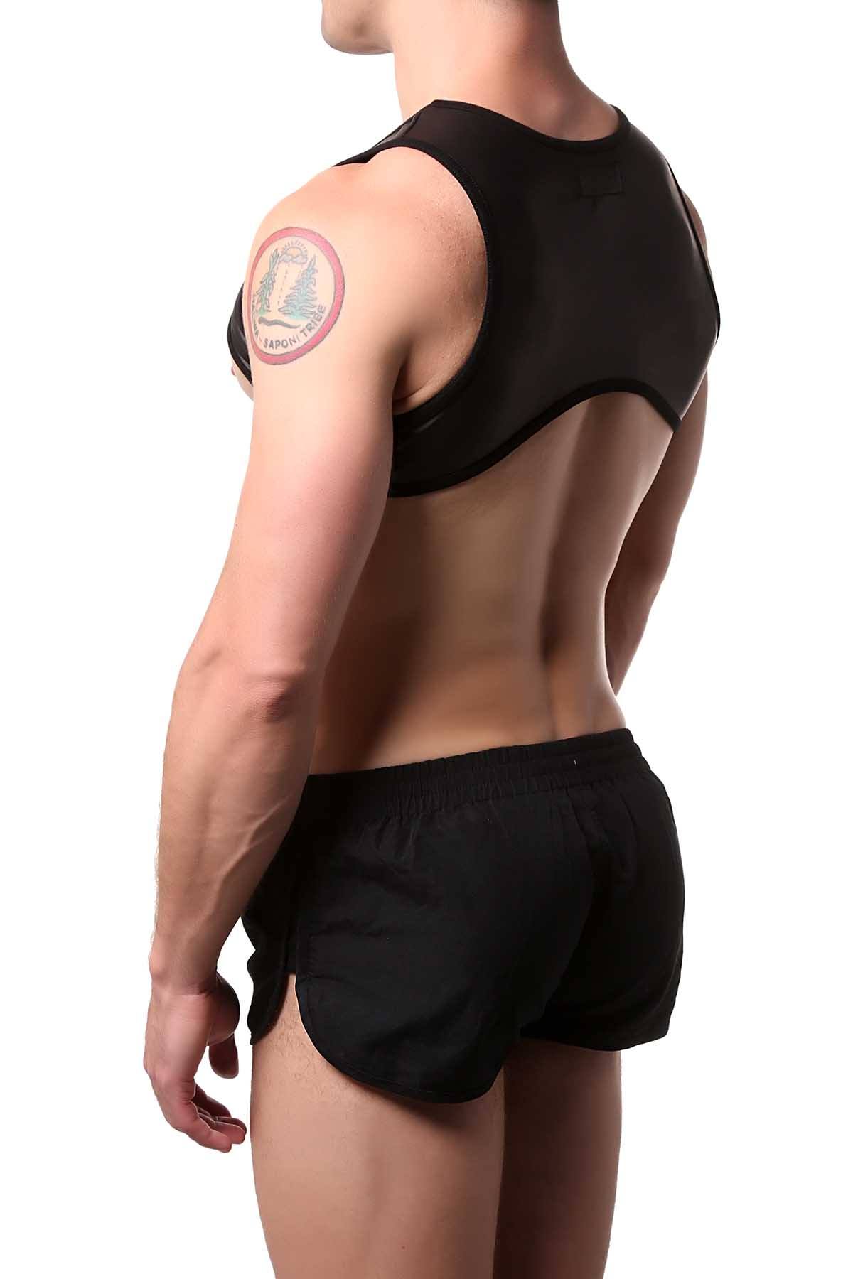 Take a walk on the wild side or explore your inner bad boy in this newest creation by GO SOFTWEAR! The Fetiche harness is the latest introduction from our sexy and provocative HARD CORE line. This garment is constructed in faux-leather stretch fabric with a dark matte finish along with contrast color trim. The flexible and lightweight material allows the harness to mold and effortlessly go over the upper body without the fuss of adjustable straps or hooks.