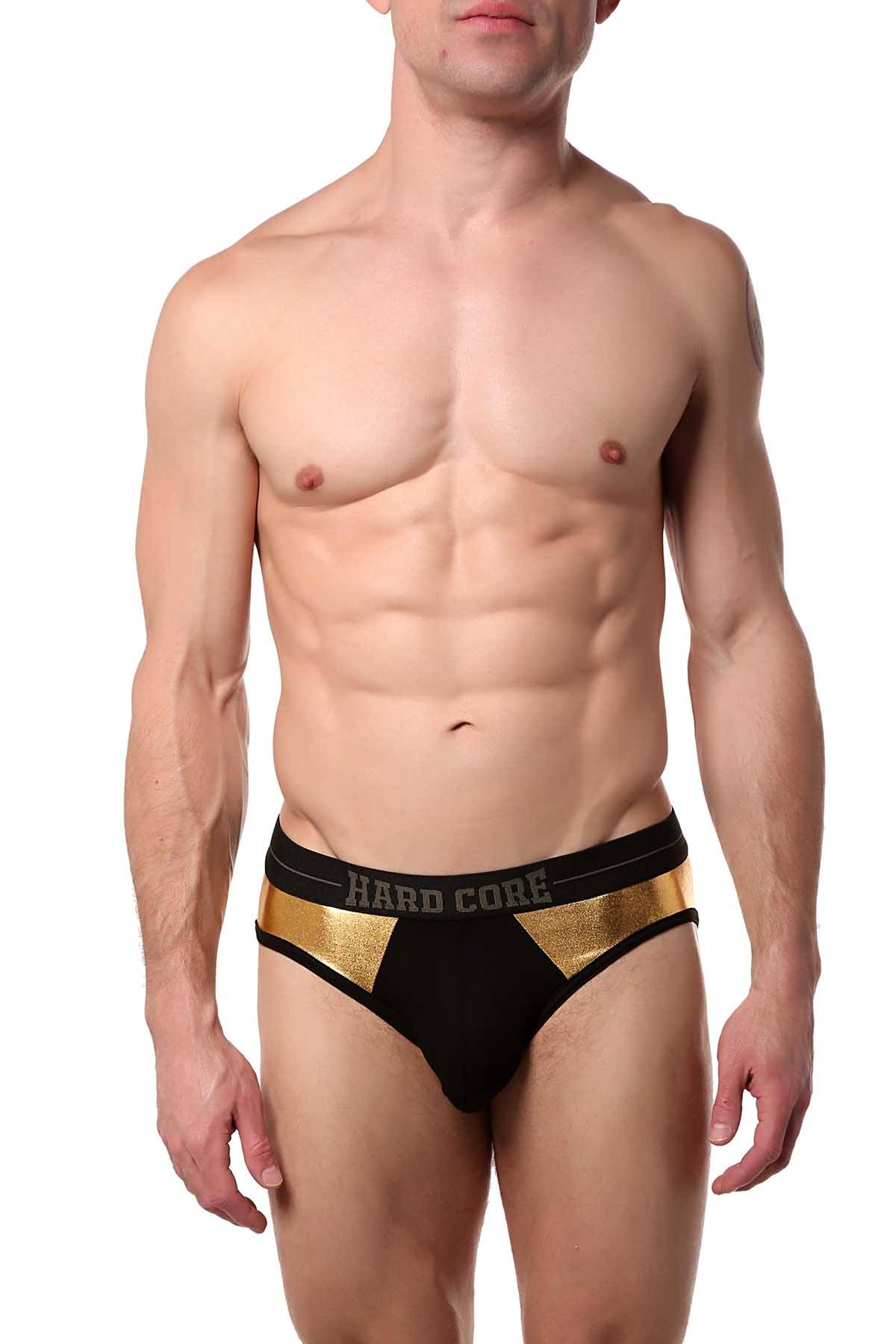 - The HARD CORE GOLD jock brief is created from rayon/spandex fabric along with gold metallic panel insets for a unique fashion forward look.