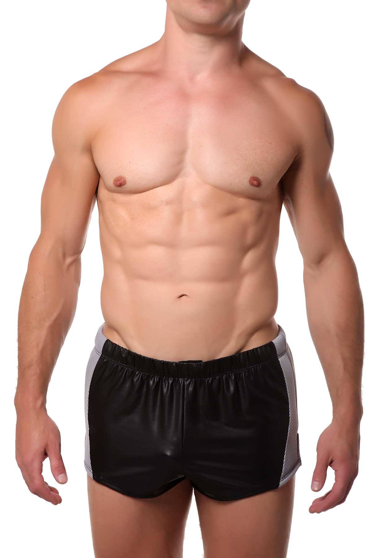 - The ARMOR chamber short, part of our HARD CORE line is constructed from a faux-leather stretch fabric along with contrast textured-foam like mesh side panels for a sporty & edgy look.