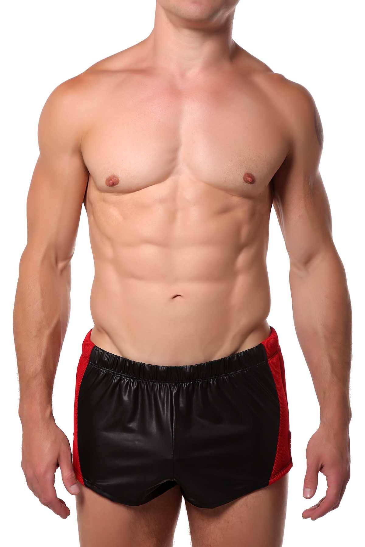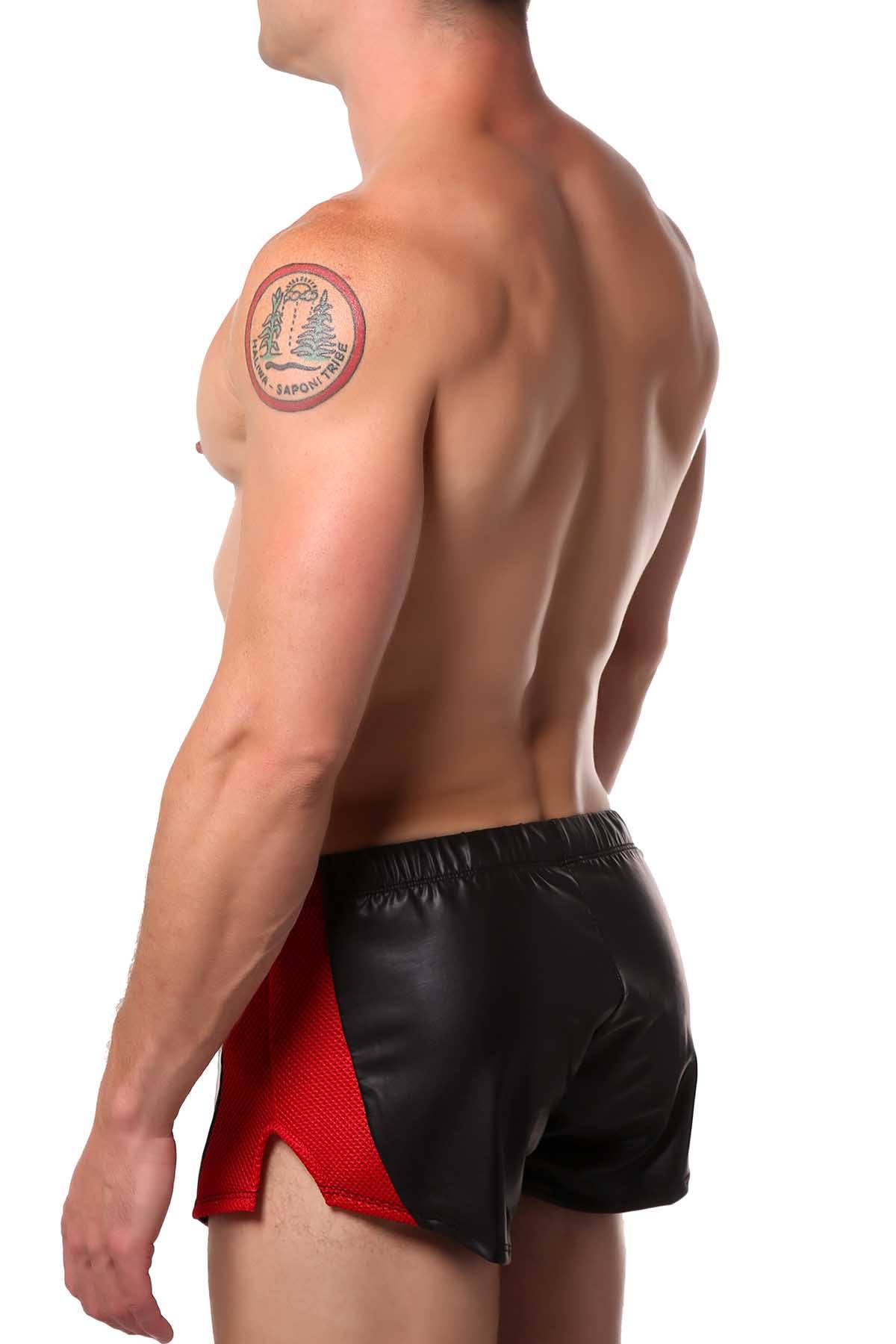 - The ARMOR chamber short, part of our HARD CORE line is constructed from a faux-leather stretch fabric along with contrast textured-foam like mesh side panels for a sporty & edgy look.