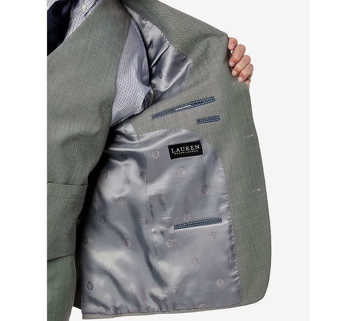 Move freely throughout your day in style with the classic tailoring and unrestrictive stretch performance of this suit jacket from Lauren Ralph Lauren.Regular fit through the shoulders chest and waist with standard armholes and sleeves; Jacket sizing is indicated by a number and a letter; Number refers to chest size Letter refers to length of Jacket based upon height: S=5'7" and under; R=5'8"-5'11"; L=6' and up; Matching vest and pants sold separately Notched lapel; Two-button closure; four-button cuffs; Two front flap pockets left chest welt pocket; interior welt pockets; Side vents; fully lined; stretch performance; Shell: wool/polyester; lining: polyester/viscose; Dry clean; Imported