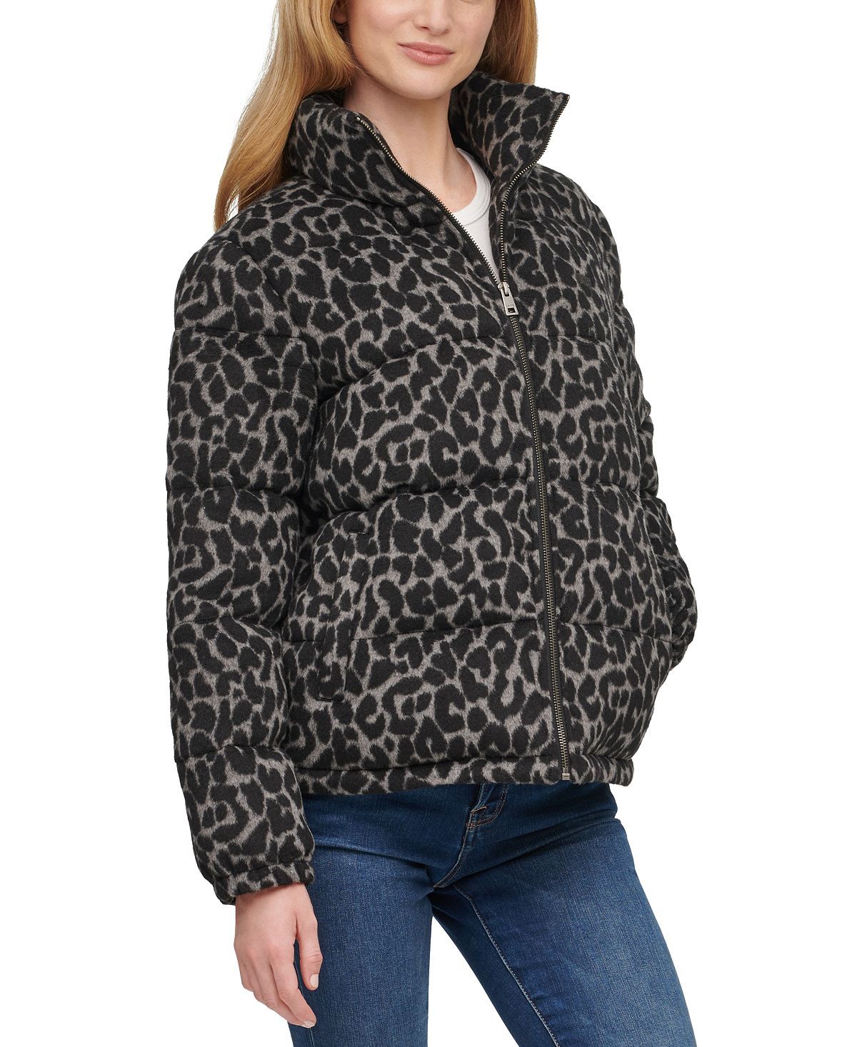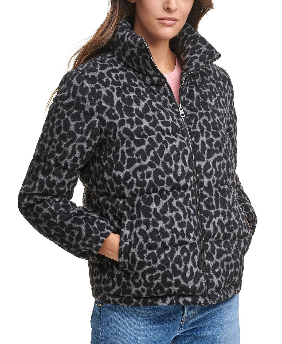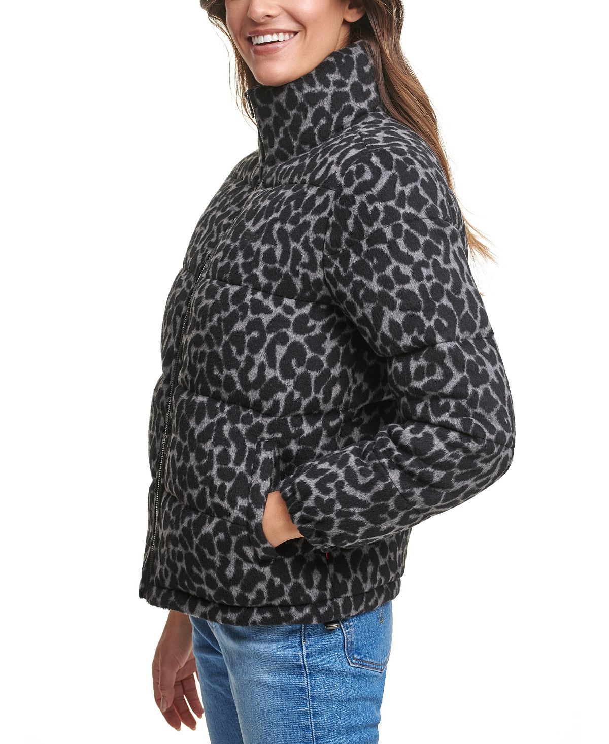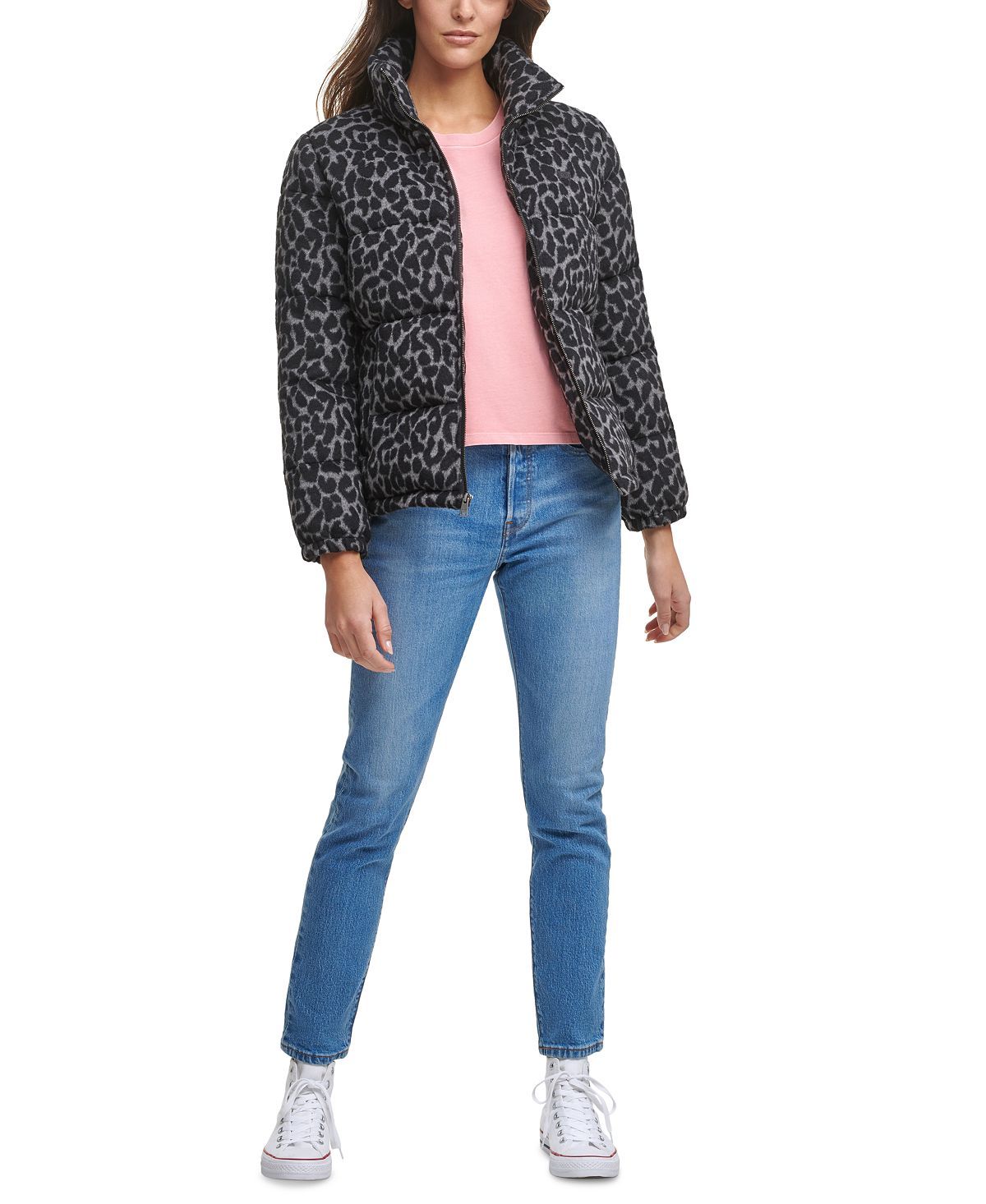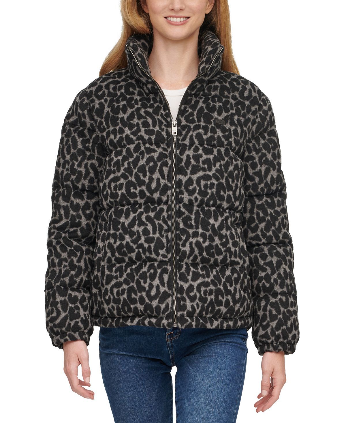 Styled in a soft leopard print for a fierce finish this cropped bubble puffer jacket from Levi'swarms up your look on chilly days.Approx. model height is 5'10" and she is wearing a size small; Approx. length: 25-1/4" from center back to hem Stand collar; zipper closure at front Adjustable drawstring at inner hem; Levi's Red Tab on lower left side seam Two lower welt zipper pockets; Long sleeves with elastic cuffs; Lined; Shell lining: polyester/acrylic/wool; Machine washable; Imported