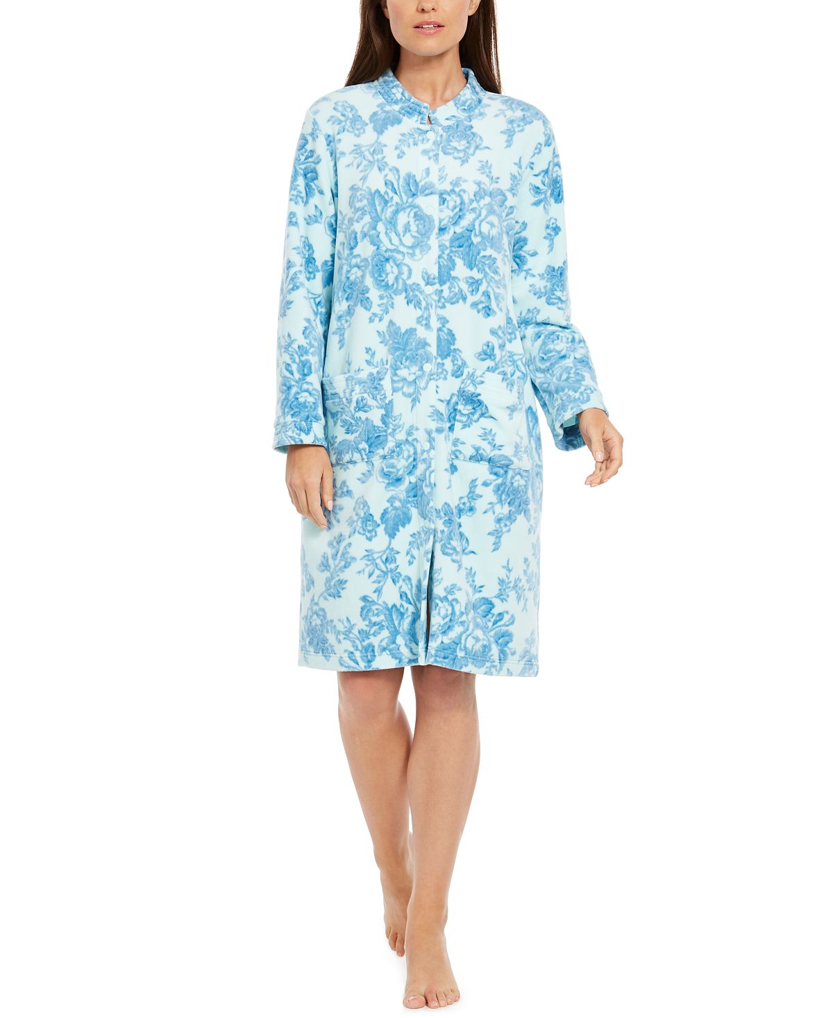 Soft plush and luxurious. Wrap yourself in cozy comfort with Miss Elaine's floral-print fleece robe. Length: Approx. 41" long; Special Features: Two pockets at front; Closure: Snap-front closures; Sleeve Length: Long sleeves; Polyester/spandex; Machine washable; Imported