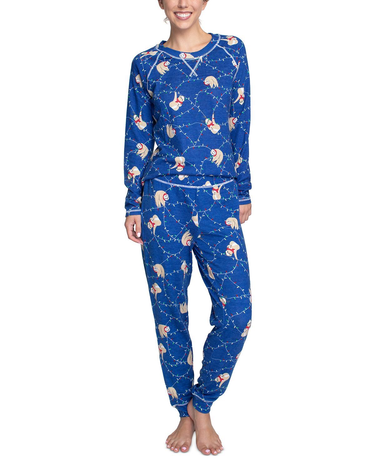 Muk Luks keeps you cozy and festive in this soft and breathable pajama set featuring a matching sleep mask.Top: hits at hip; hacci fabric; seaming details; crewneck; pullover styling; long sleeves; Bottom: hits at ankle; hacci fabric; seaming details; elastic waist; Includes matching sleep mask; Hacci is an easy-care synthetic knit fabric with all the softness and breathability of cotton; Polyester/rayon/spandex; Machine washable; Imported