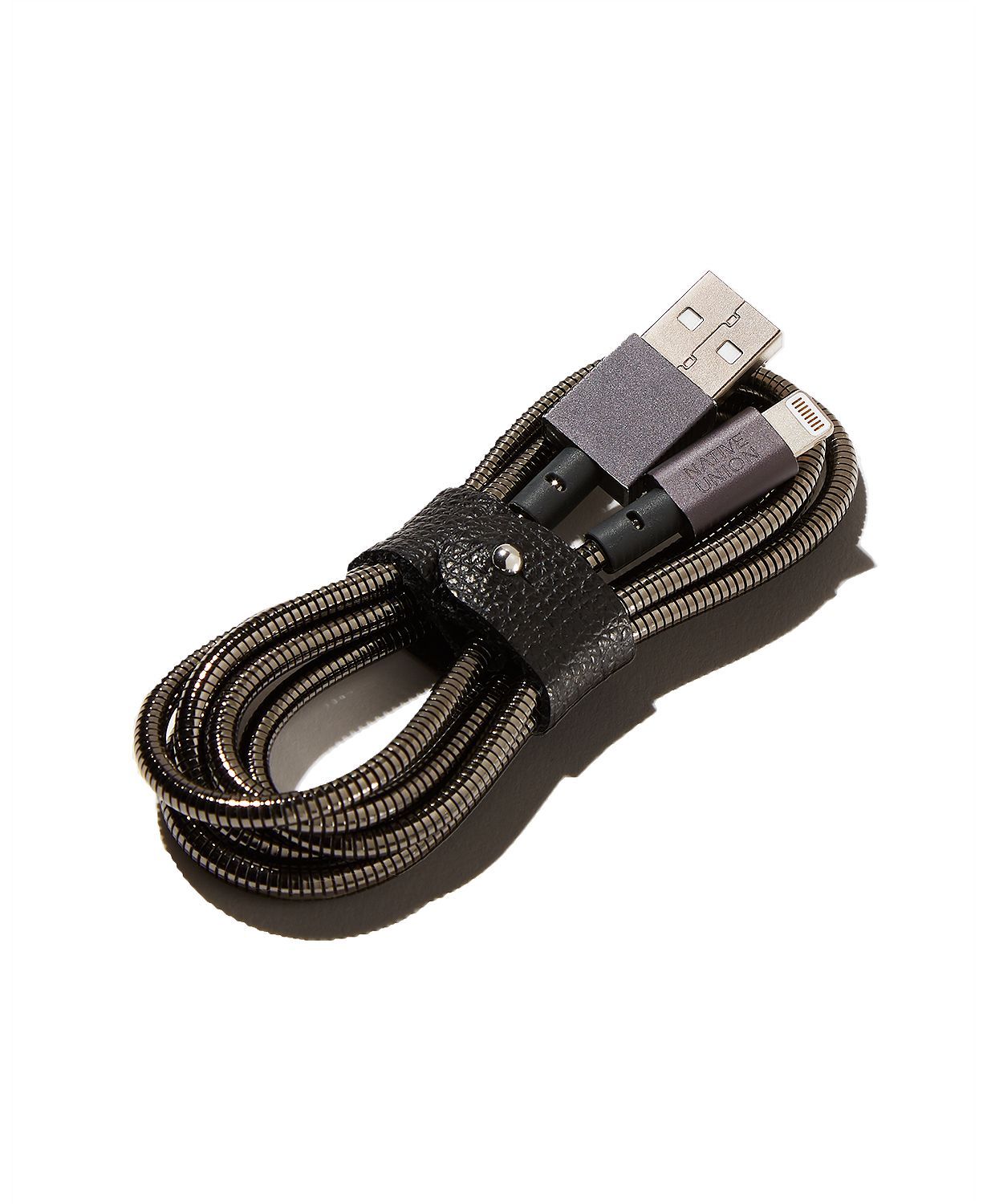 Native Union x Tom Dixon Coil Belt Cable47.2"L; Ultra-strong belt cable cast in plated metal sleeve; Designed with a genuine leather strap for tangle-free storage; Compatible with iPhone and iPad devices; A collaboration between Native Union and Tom Dixon; Manufacturer's lifetime warranty; Steel/TPE (thermoplastic elastomer)/aluminum/leather; Imported