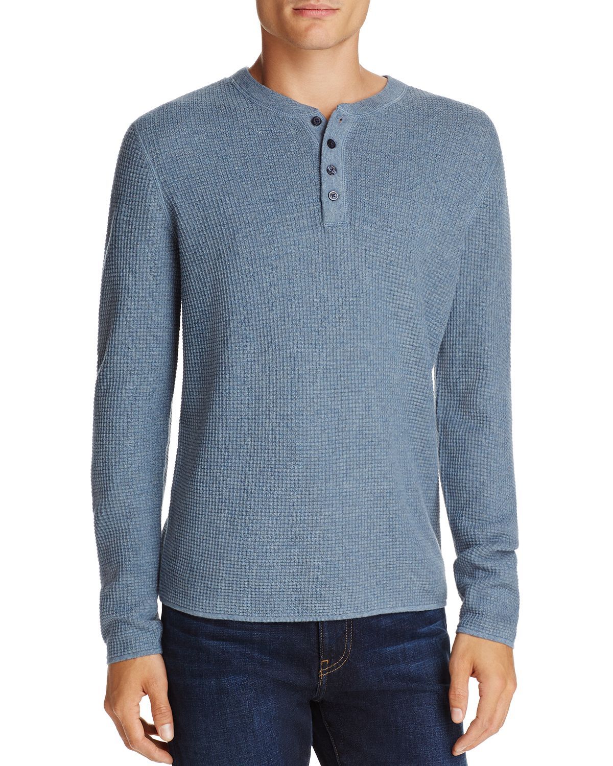 On its own or as a layering piece this Original Penguin henley adds texture to your look. Available exclusively from . Fits true to size order your normal size; Designed for a slim fit; Henley neck four-button placket waffle knit tonal logo at left side seam; Model measurements: 6'1" height 40" chest 31" waist 34" inseam wearing a size medium; Cotton/merino wool; Dry clean; Imported