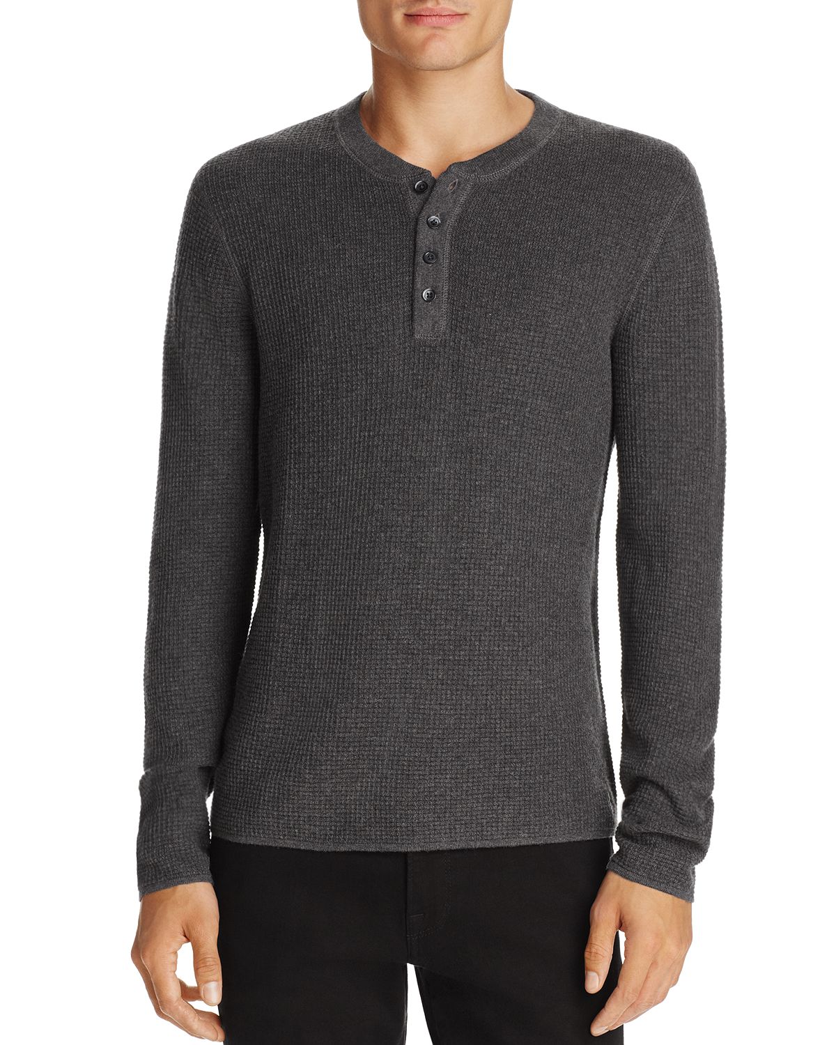 On its own or as a layering piece this Original Penguin henley adds texture to your look. Available exclusively from . Fits true to size order your normal size; Designed for a slim fit; Henley neck four-button placket waffle knit tonal logo at left side seam; Model measurements: 6'1" height 40" chest 31" waist 34" inseam wearing a size medium; Cotton/merino wool; Dry clean; Imported