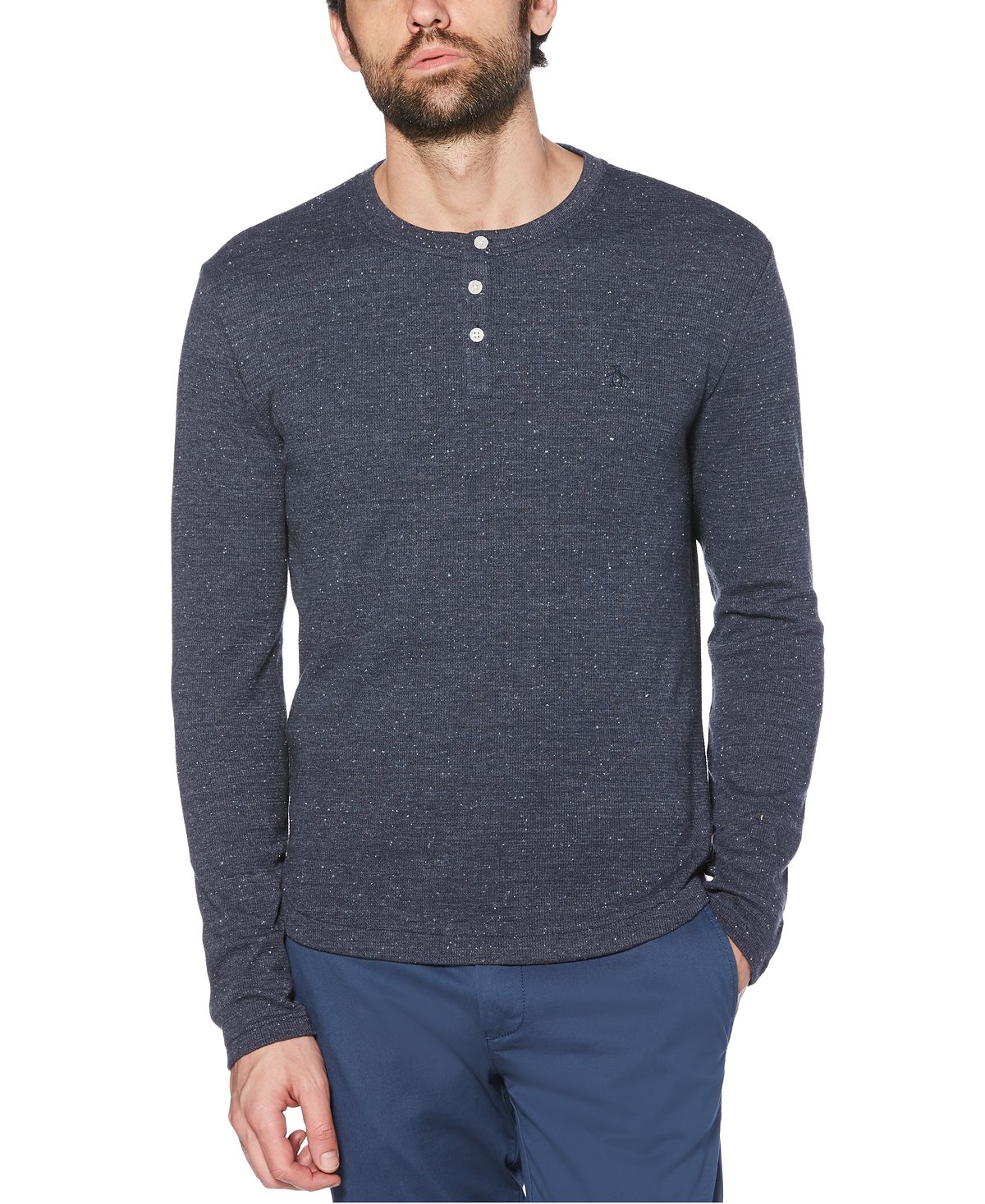 Embrace cool laid-back style and comfort ideal for layering with the solid design and and waffle knit fabrication of this long sleeve Henley t-shirt by Original Penguin.Regular fit; Henley collar; Three-button placket; Original Penguin embroidered logo at left chest; Waffle knit fabrication for added texture warmth and airflow; Cotton/polyester; Machine washable; Imported