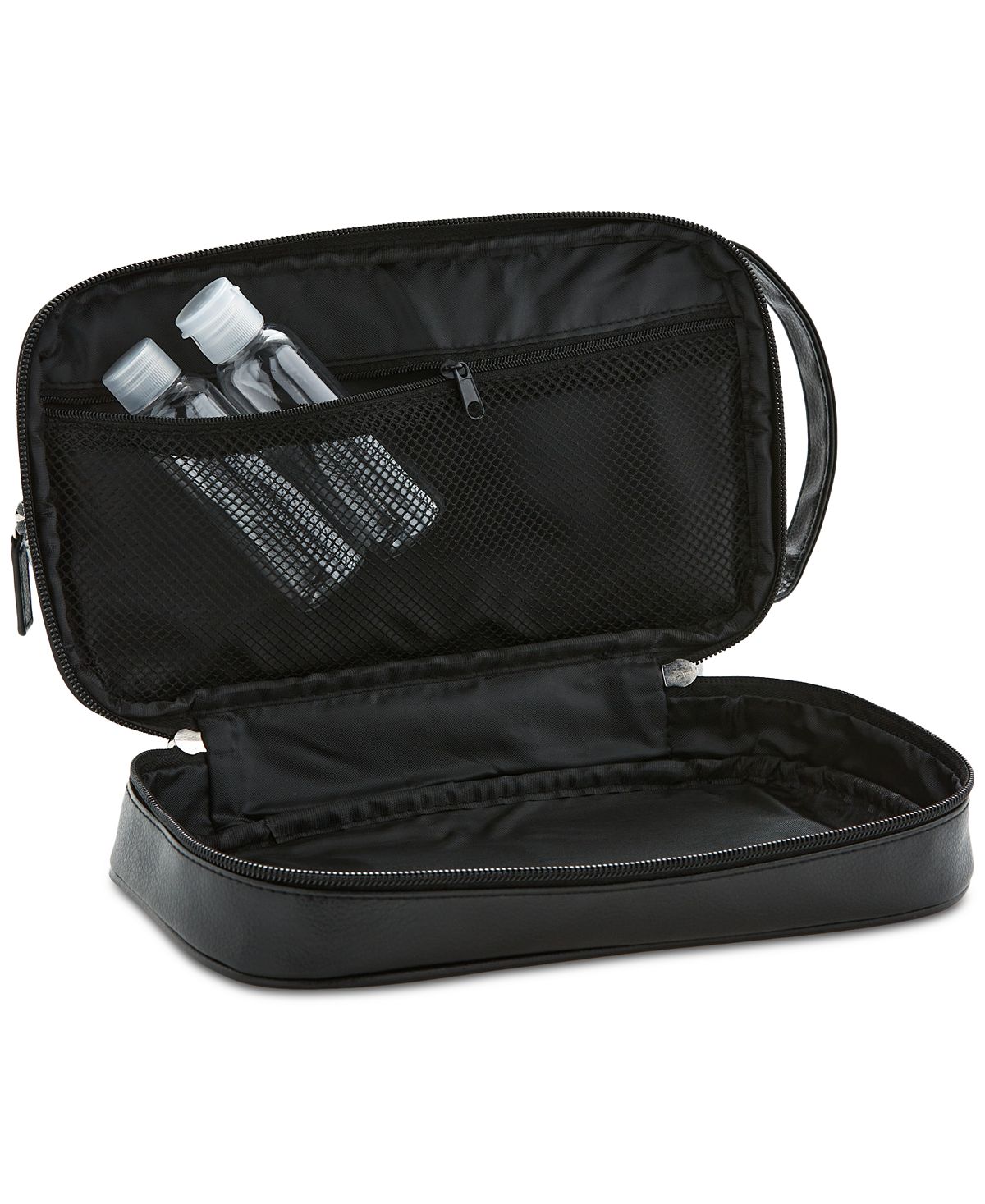 A convenient bottom compartment gives you quick access to small items while a roomy interior organizes the rest in this travel case from Perry Ellis. Faux leather lends a stylish look.Exterior dimensions: 10.5"L x 6"W x 5.5"H; Interior: water-resistant; Exterior: faux leather; zip compartment at bottom; zip closure at top; Handle: carrying handle; Polyurethane/polyester/cotton; Spot clean only; Imported