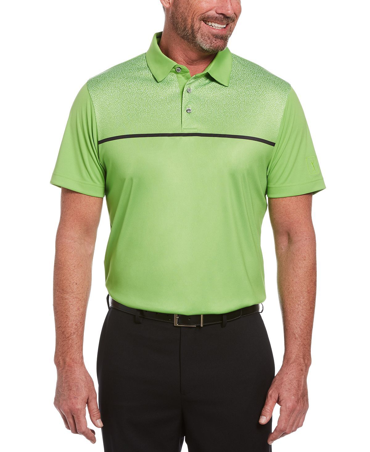 Add a touch of contemporary style to your golf game with the texture-print pattern and bold contrast stripe featured at the chest of this flexible interlock polo shirt from PGA TOUR. Spread collar; three-button closure; Textured-print pattern at chest; contrast stripe at chest; embroidered logo at left sleeves; Polyester; Machine washable; Imported