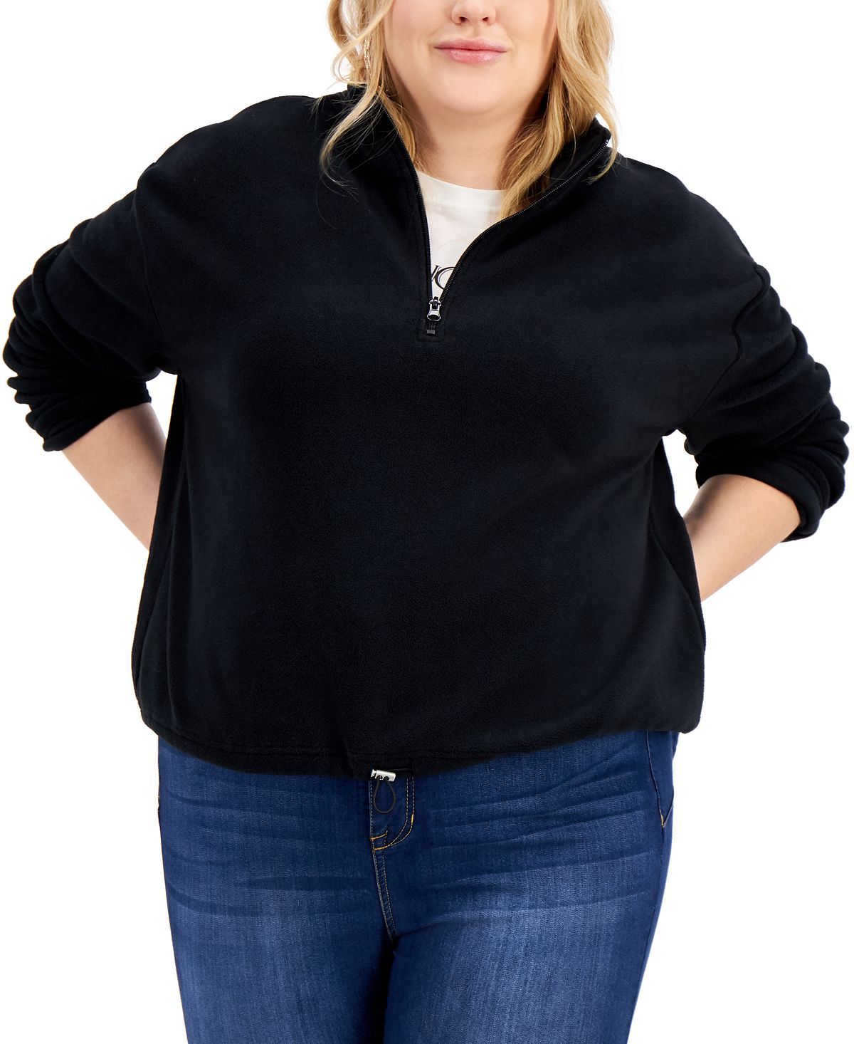 Zip up some super-soft (and cozy) style this season with a versatile fleece from Planet Gold.Approx. model height is 5'10" and she is wearing a size 2X; Stand collar; half-zip front closure; Fleece; bungee hem Polyester; Machine washable; Imported