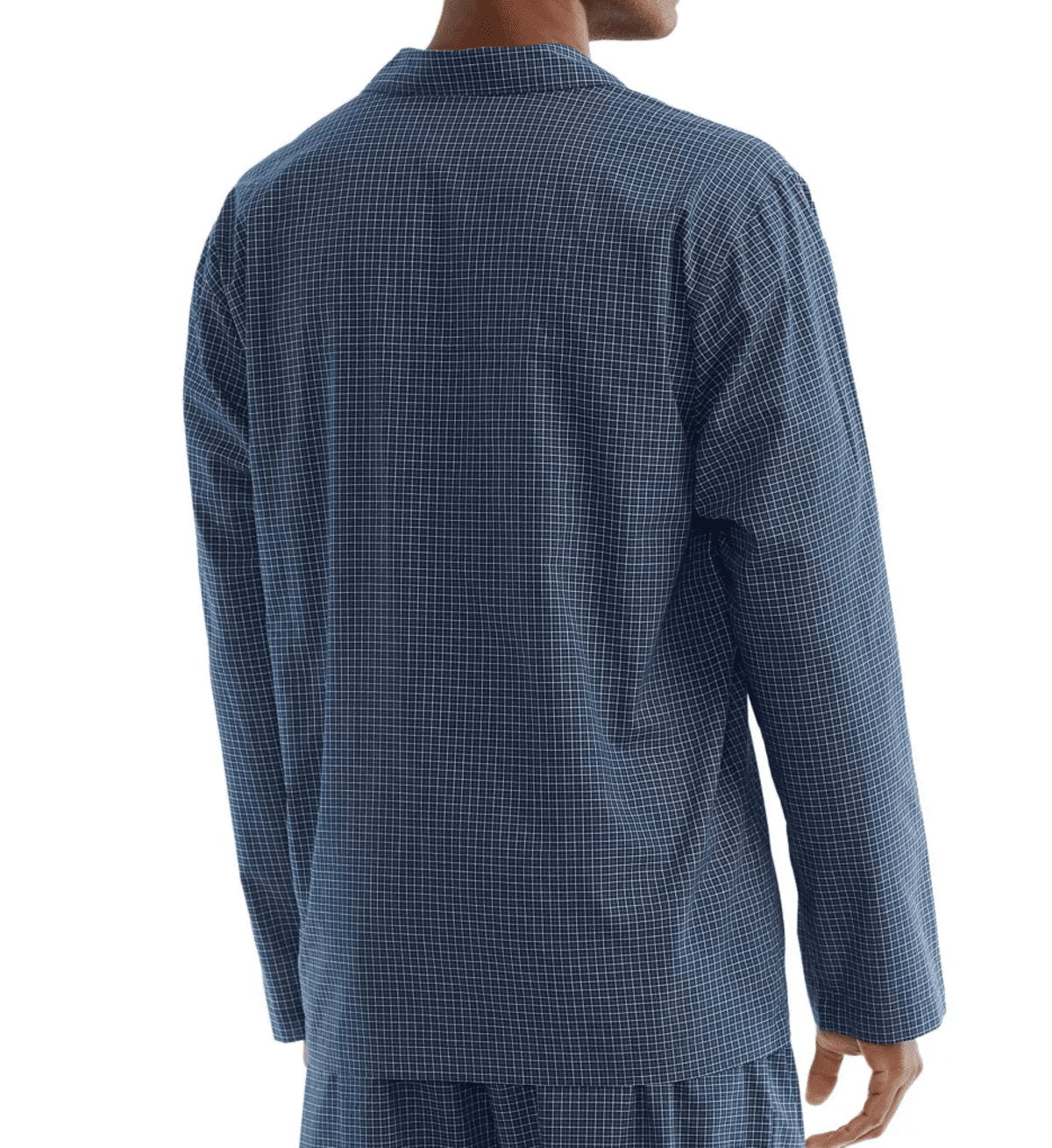 Classic pajama top features all-cotton comfort and a modern take on a traditional pattern. Made of woven 100% cotton. Open standard collar with piping. Full button front with five large buttons. Long sleeves. Straight-cut sides. Chest pocket at left with Polo player logo embroidery. Straight hem. Hang loop on inside of collar. Lightweight woven cotton is perfect anytime of year.
