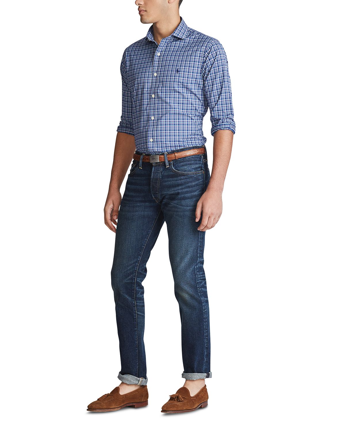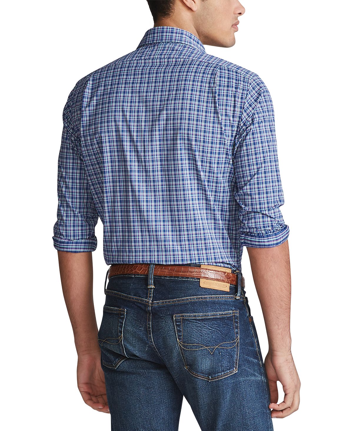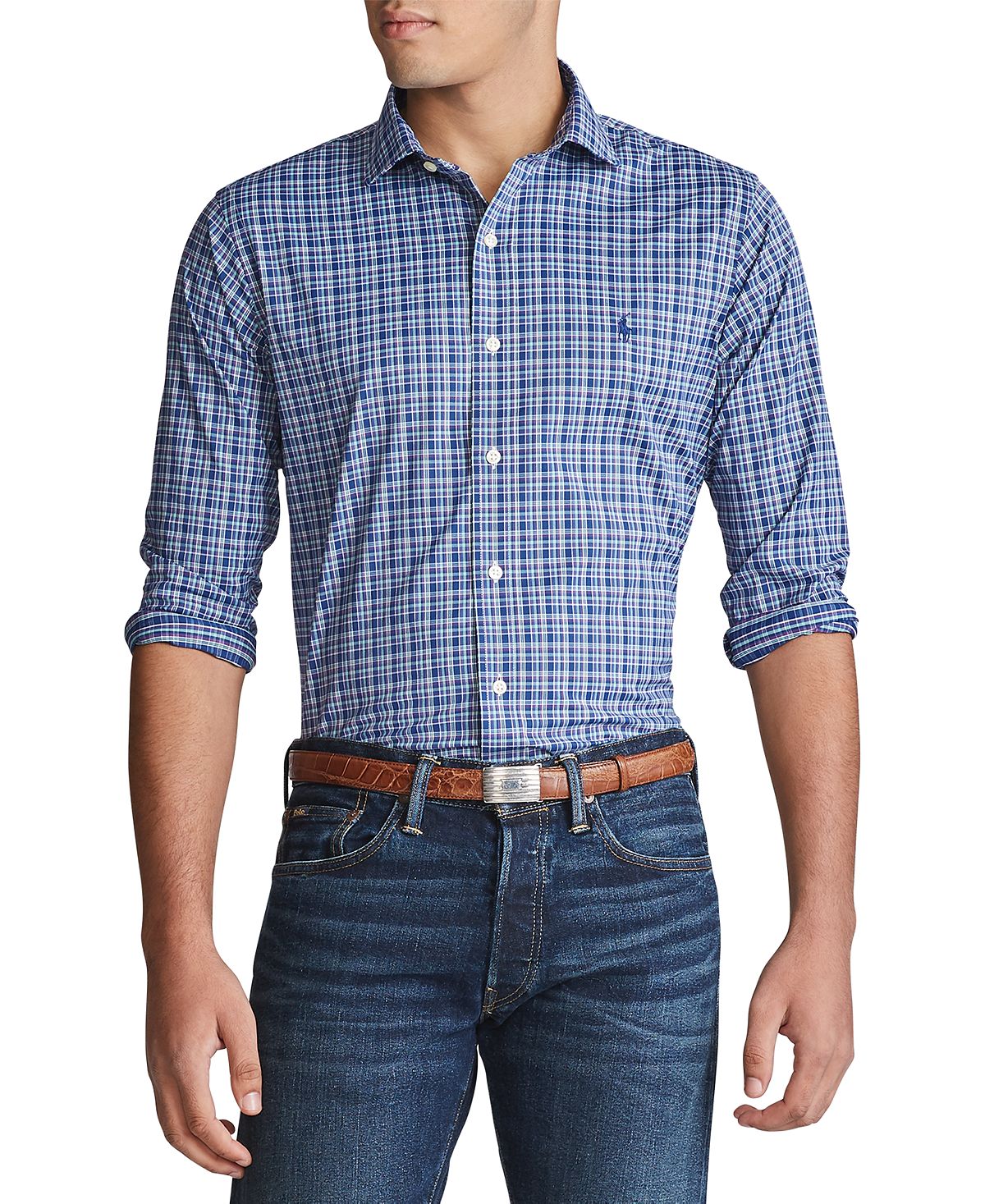 In moisture-wicking stretch twill Polo Ralph Lauren's plaid shirt offers superior comfort and breathability from morning to night.Approx. model height is 6'1" and he is wearing a size medium; Classic Fit: Polo Ralph Lauren's roomiest silhouette. Cut for a lower armhole and a fuller sleeve; Medium-spread collar; Signature collar stays; Buttoned placket; Long sleeves with buttoned barrel cuffs; Split pleated back yoke ensures smooth contoured shoulders Moisture-wicking; Nylon/elastane; Machine washable; Imported