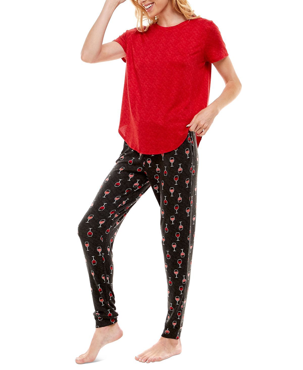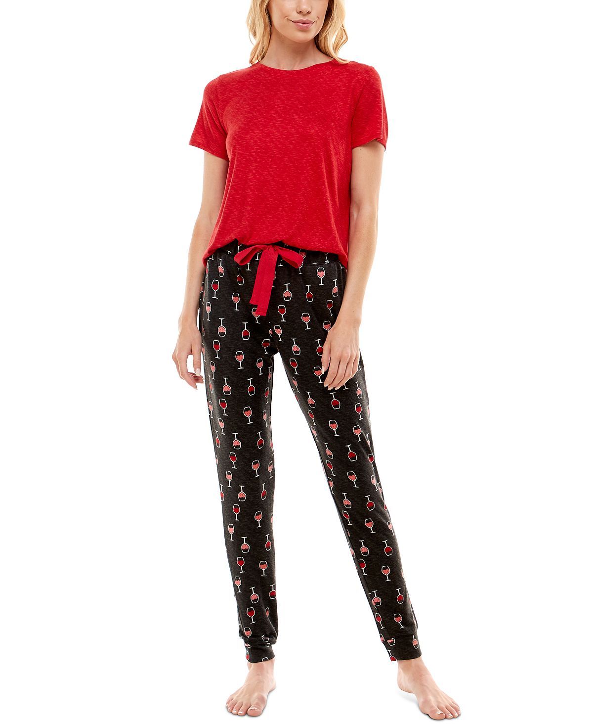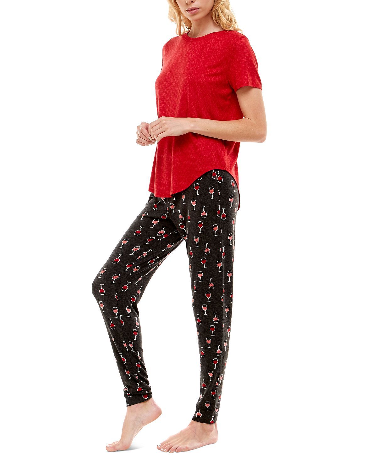 A solid top pairs with printed jogger pants on this ultra-soft pajama set from Roudelain.Top: hits at hip; crewneck; pullover styling; short sleeves; Bottom: hits at ankle; cinched hem; drawstring at elastic waistband; Polyester/spandex; Machine washable; Imported