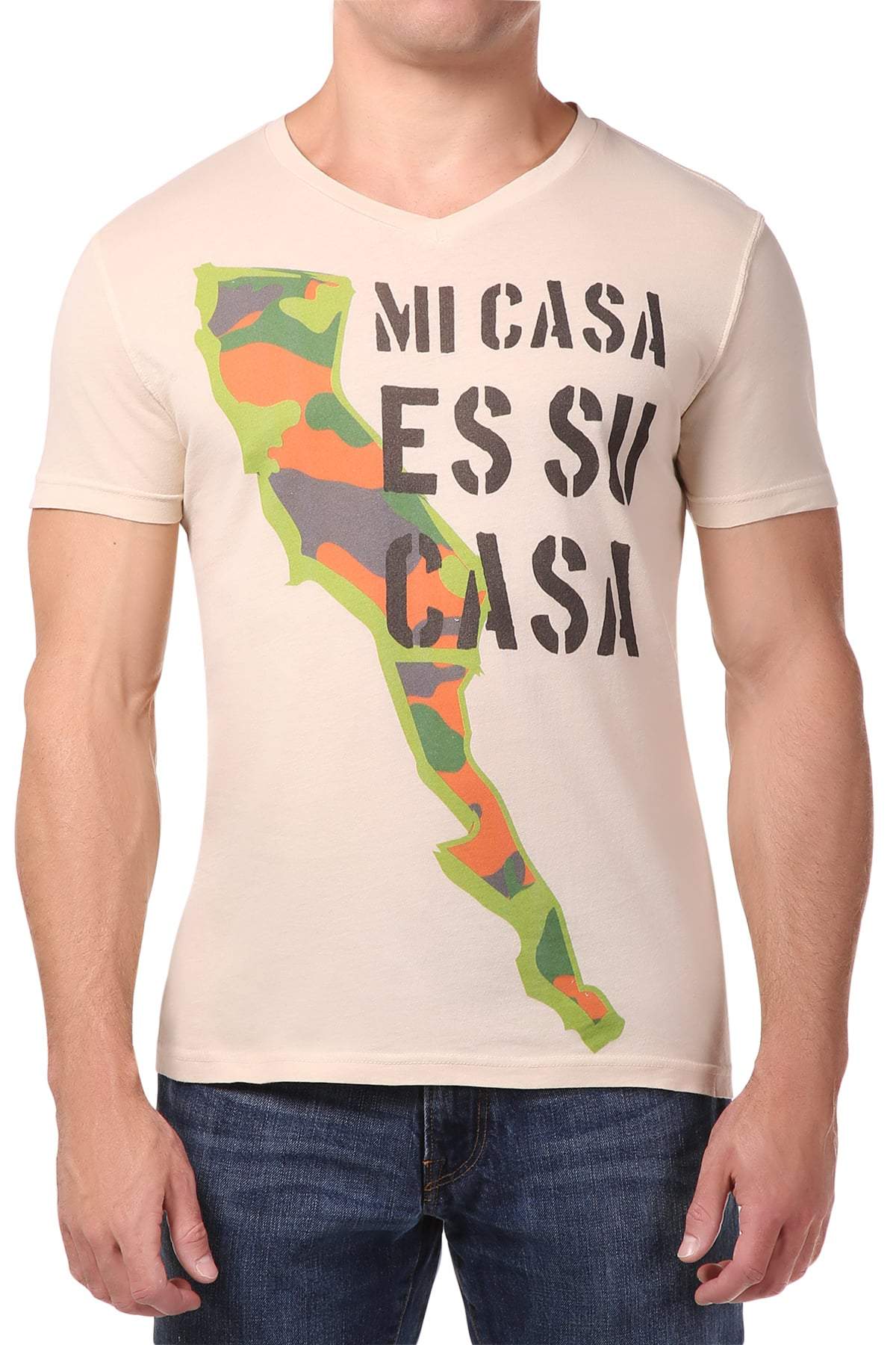 - Details: Tan body; "Mi Casa" graphic across front; Finished hem.