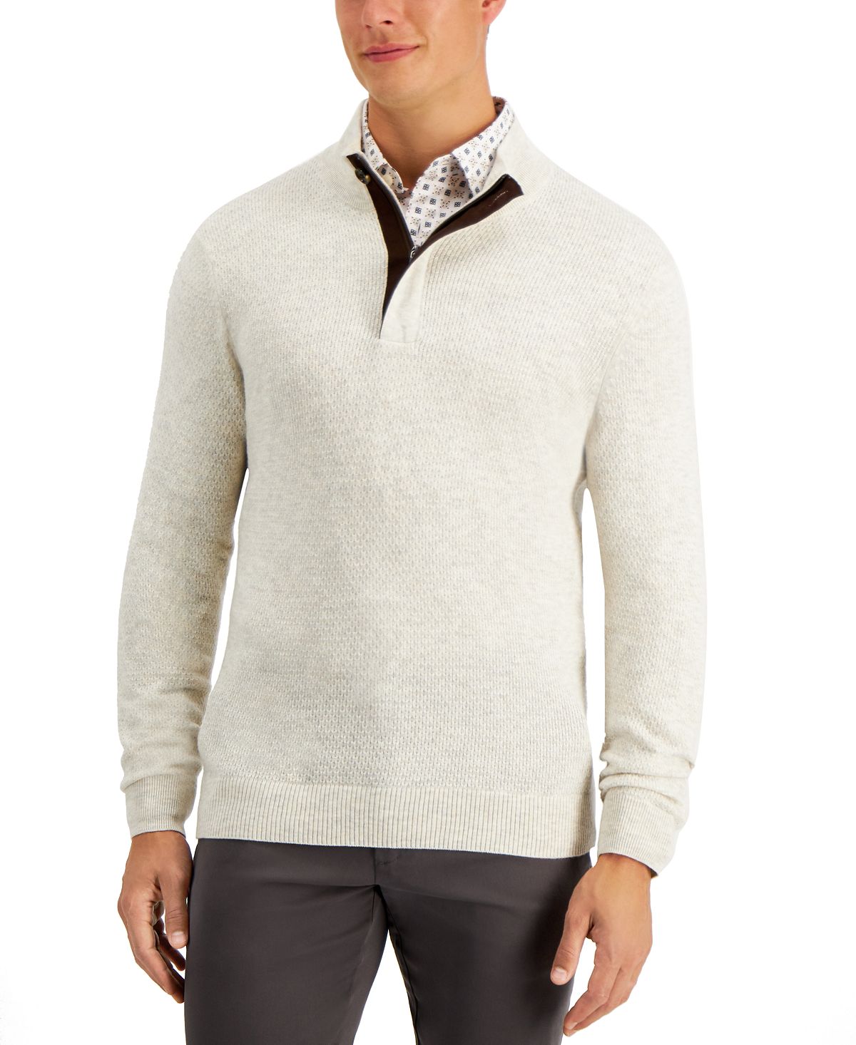 Boasting a quarter zip placket with contrast trim for a modern edge this Tasso Elba sweater offers just the right amount of warmth and style. Classic fit; Stand collar; quarter-zip closure; Contrast trim at placket; Cotton/nylon; Machine washable; Imported