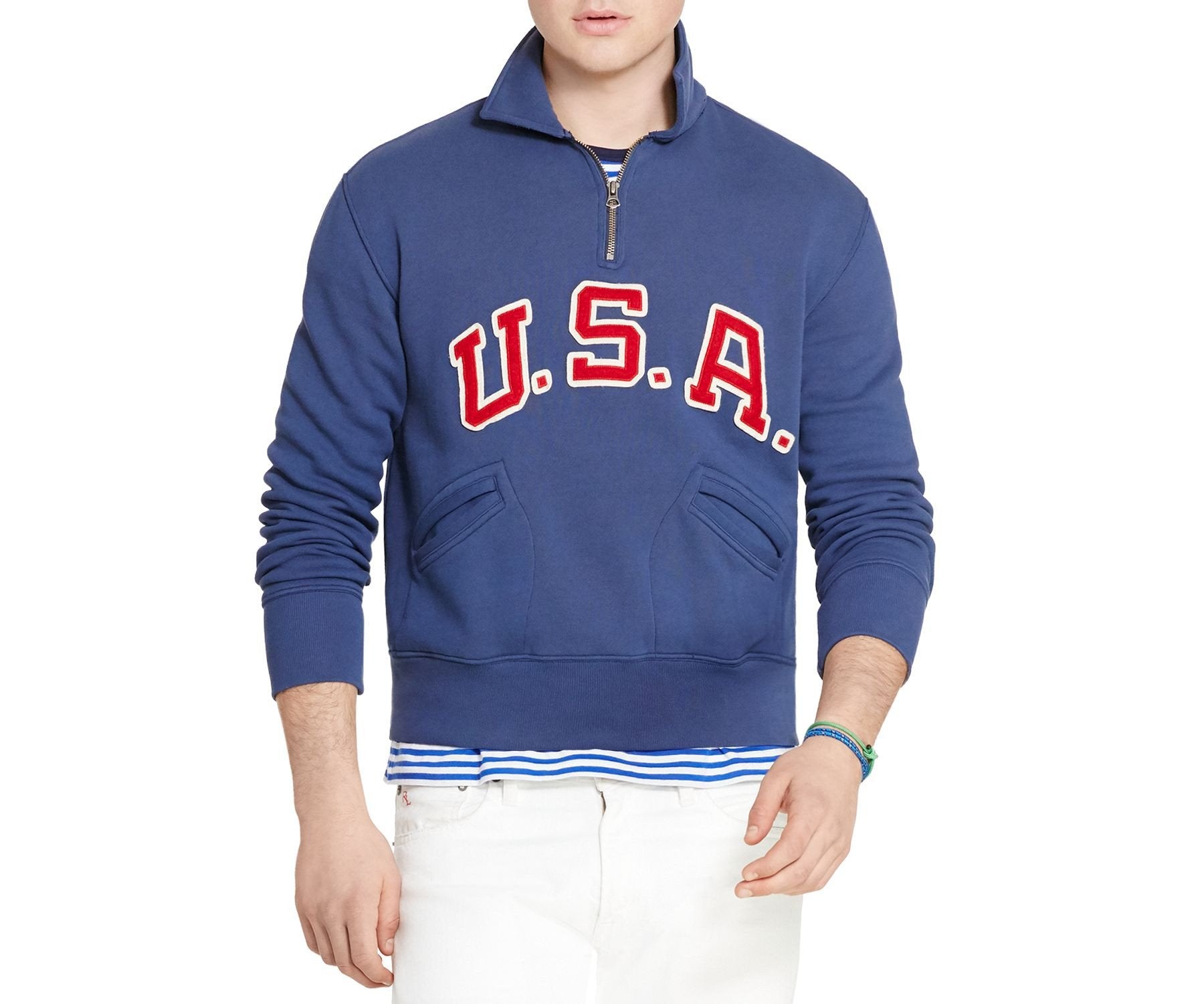 Fits true to size, order your normal size; Regular fit; Spread collar, half-zip placket, pullover style; Long sleeves with ribbed cuffs, two front waist welt pockets; Vintage-inspired felt U.S.A. lettering at the center front, ribbed waistband; Ralph Lauren is an official outfitter of the 2016 US Olympic and Paralympic Teams; Size medium has a 26.25" front body length, a 25.75" back body length, and a 25.75" sleeve length; Machine wash; Imported