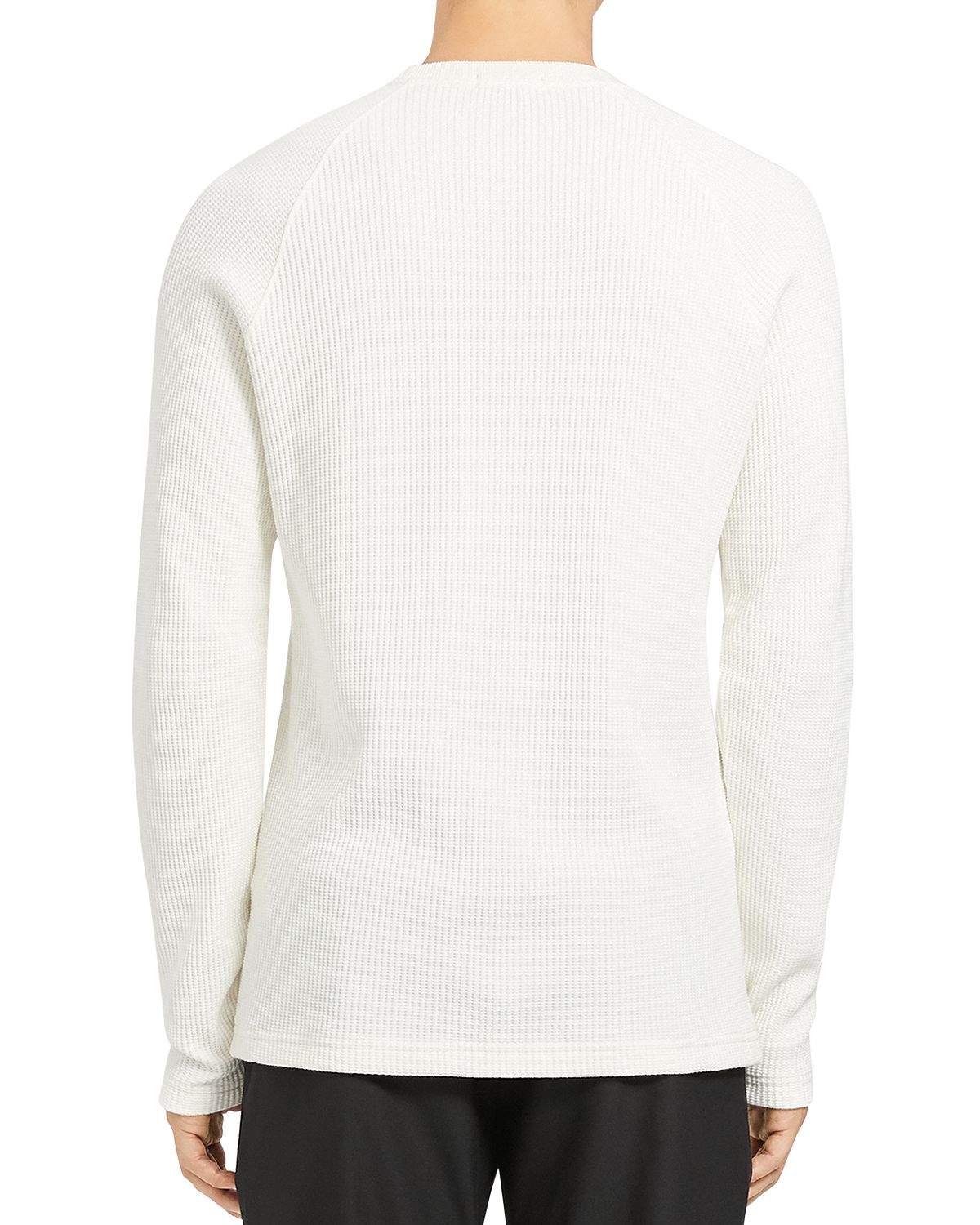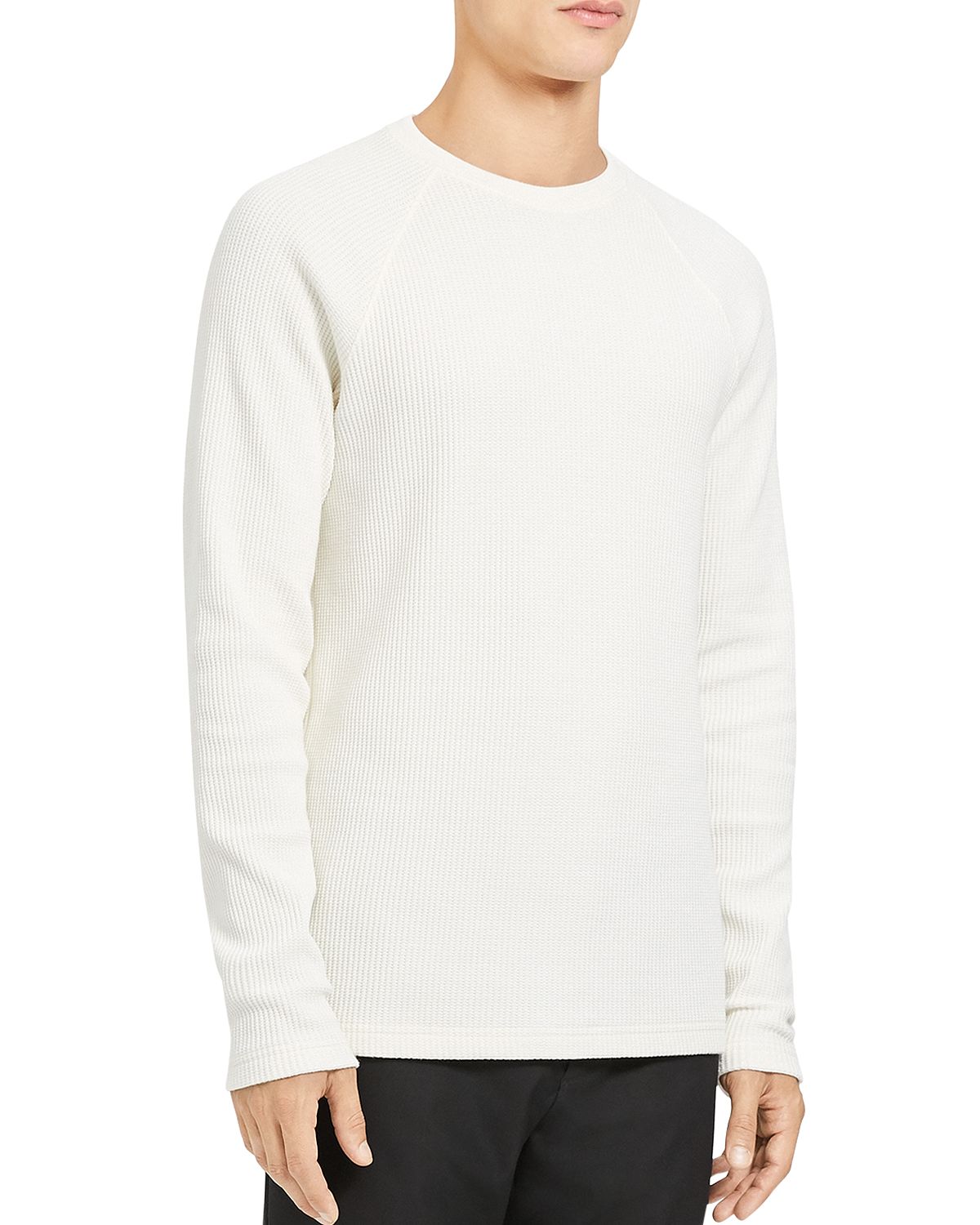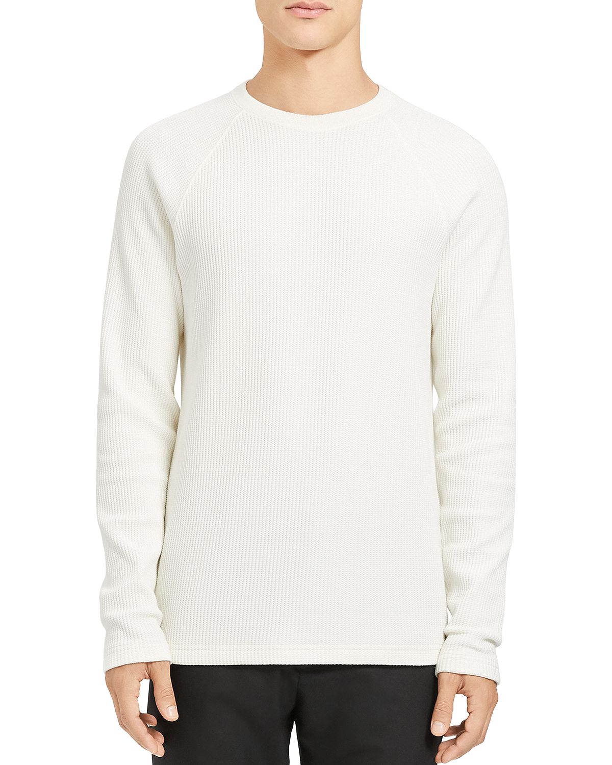 Theory River Waffle Knit Organic Cotton SweaterA simple yet sophisticated crewneck sweater made from luxe organic Peruvian cotton with a waffle texture; Model measurements: 6'2" height 38" chest 30" waist 34" inseam wearing a size medium/32; Ribbed crewneck; Long raglan sleeves; 98% cotton 2% spandex; Machine wash; Imported