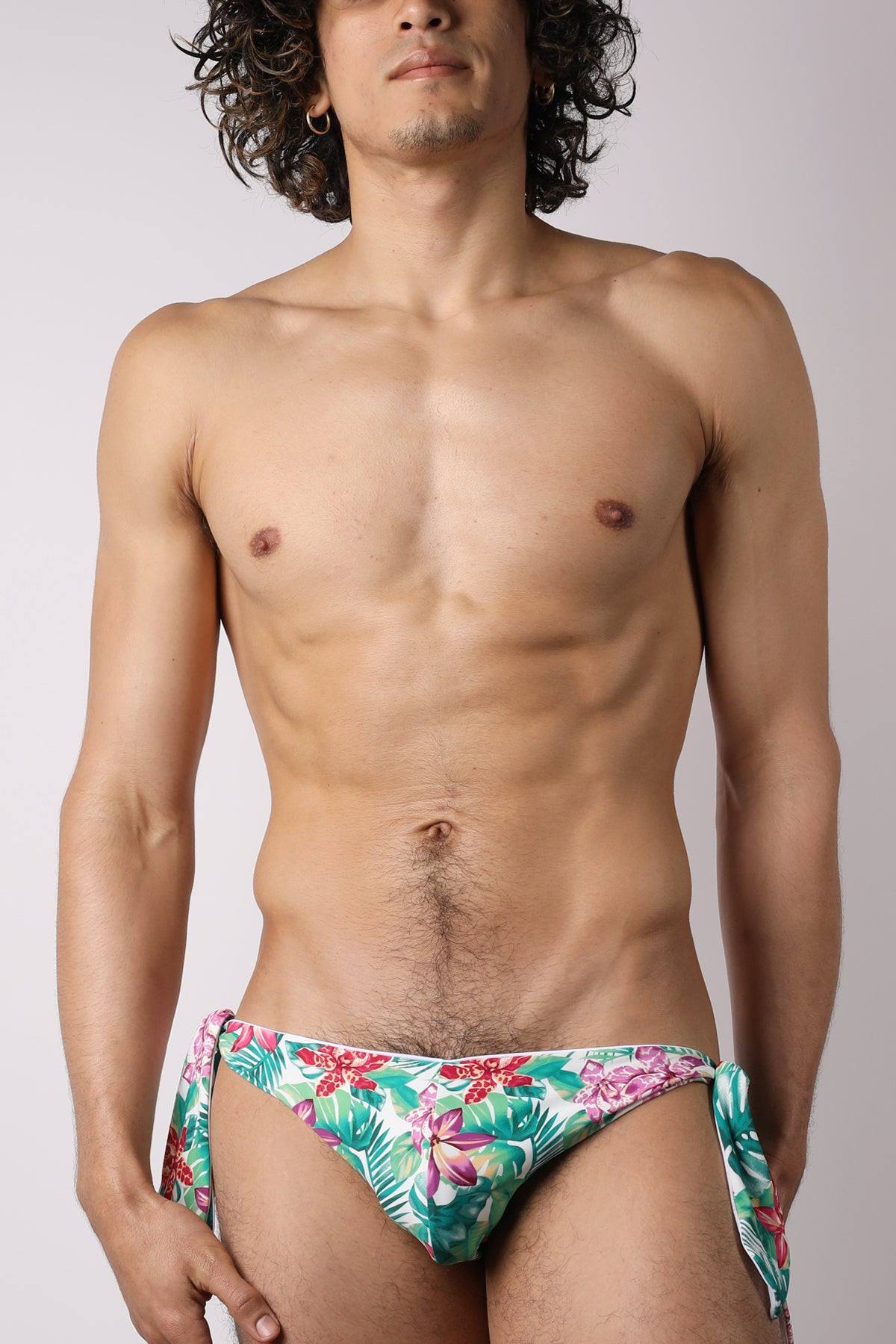 Back by popular demand! Our Tahiti side tie swim brief is reversible and gives you two looks in one. The print side features fanciful florals on perforated mesh with solid lining on the inside. Flip it inside out and the lining becomes a solid swim brief. Tie the sides as tight or loose as you desire to customize the fit.Designer Features: Reversible design, with perforated mesh floral print on one side and solid on the other; adjustable ties at sides. ** Guys with larger than normal thighs and butt, please order 1 size up.**