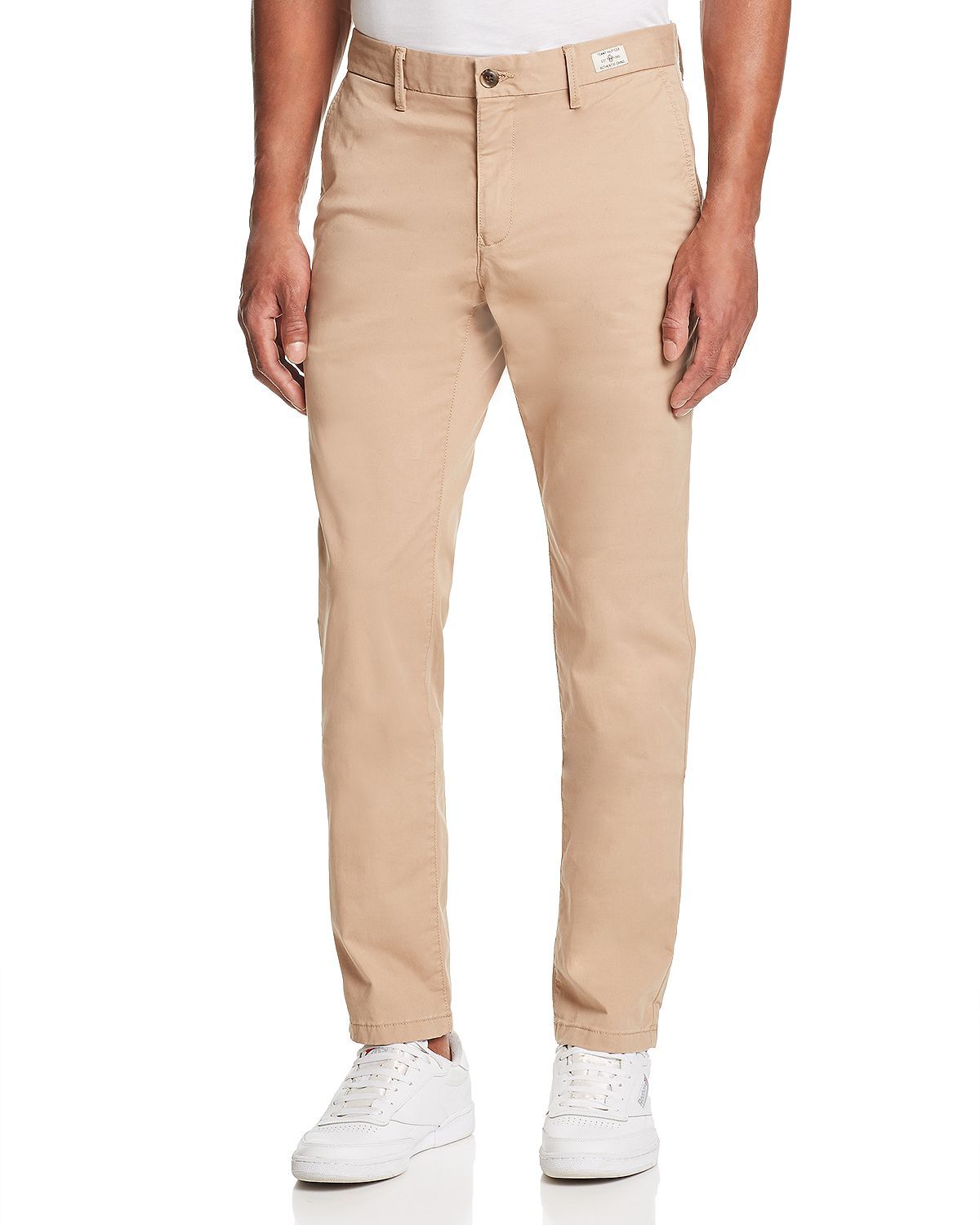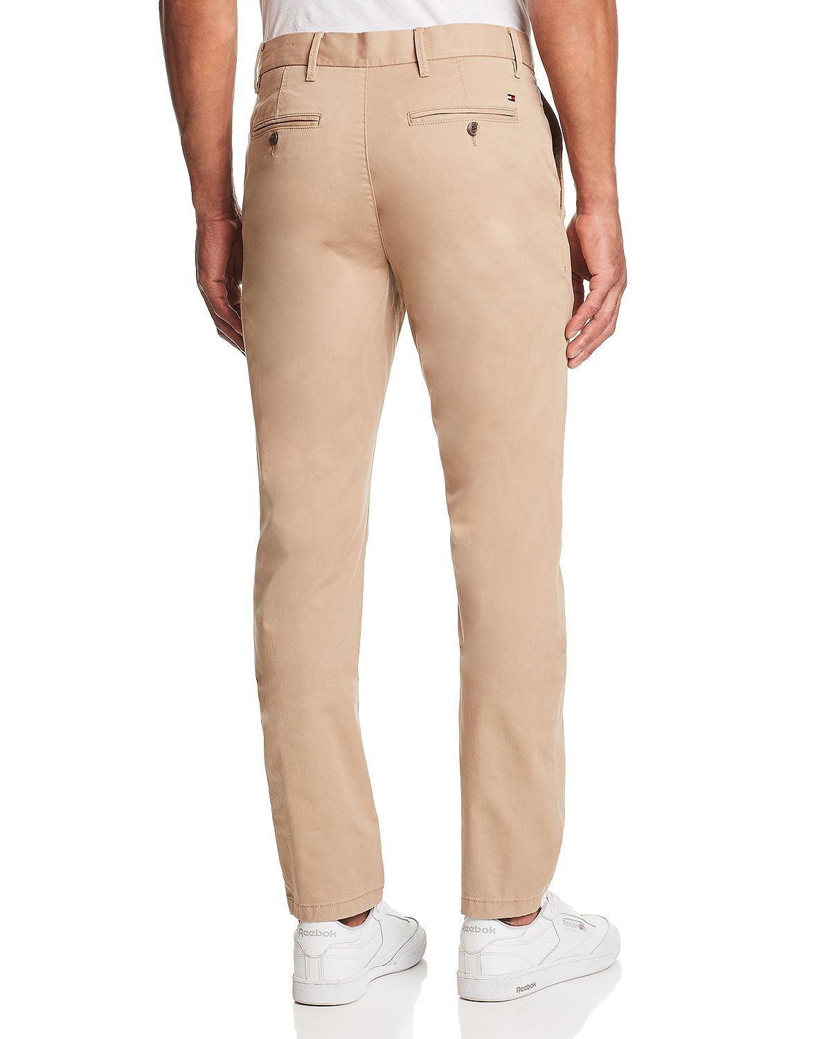 Tommy Hilfiger Denton Straight Fit ChinosFits true to size order your normal size; Designed for a straight fit; 32" inseam; Model measurements: 6'1 height 40" chest 31" waist 34" inseam wearing a size 32; Zip fly with button closure flat front belt loops; Front hand pockets buttoned back welt pockets embroidered logo; Cotton/elastane; Machine wash; Imported