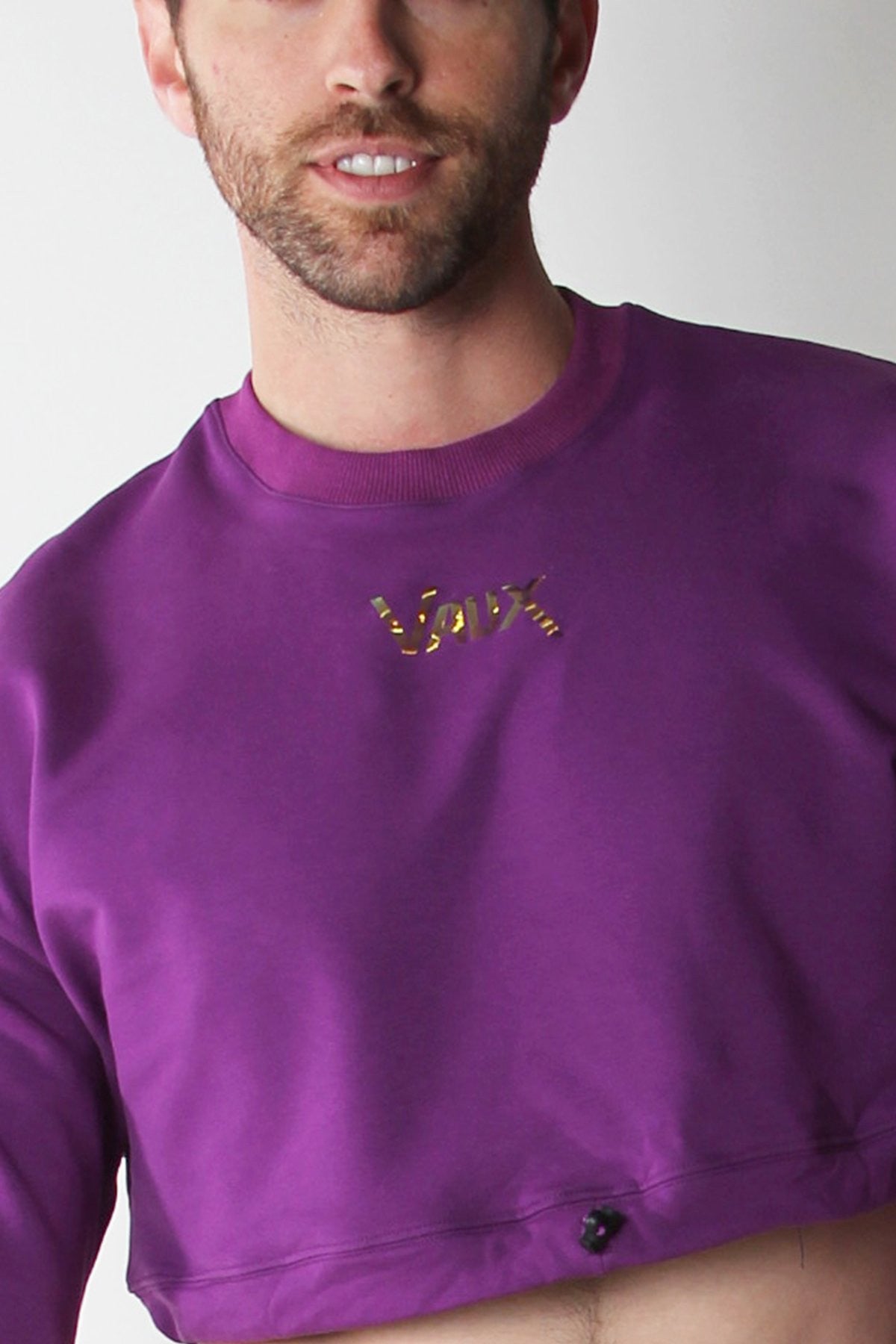 Slim fitting cropped sweater with adjustable hem, holographic Vaux heat transfer logo in the center.