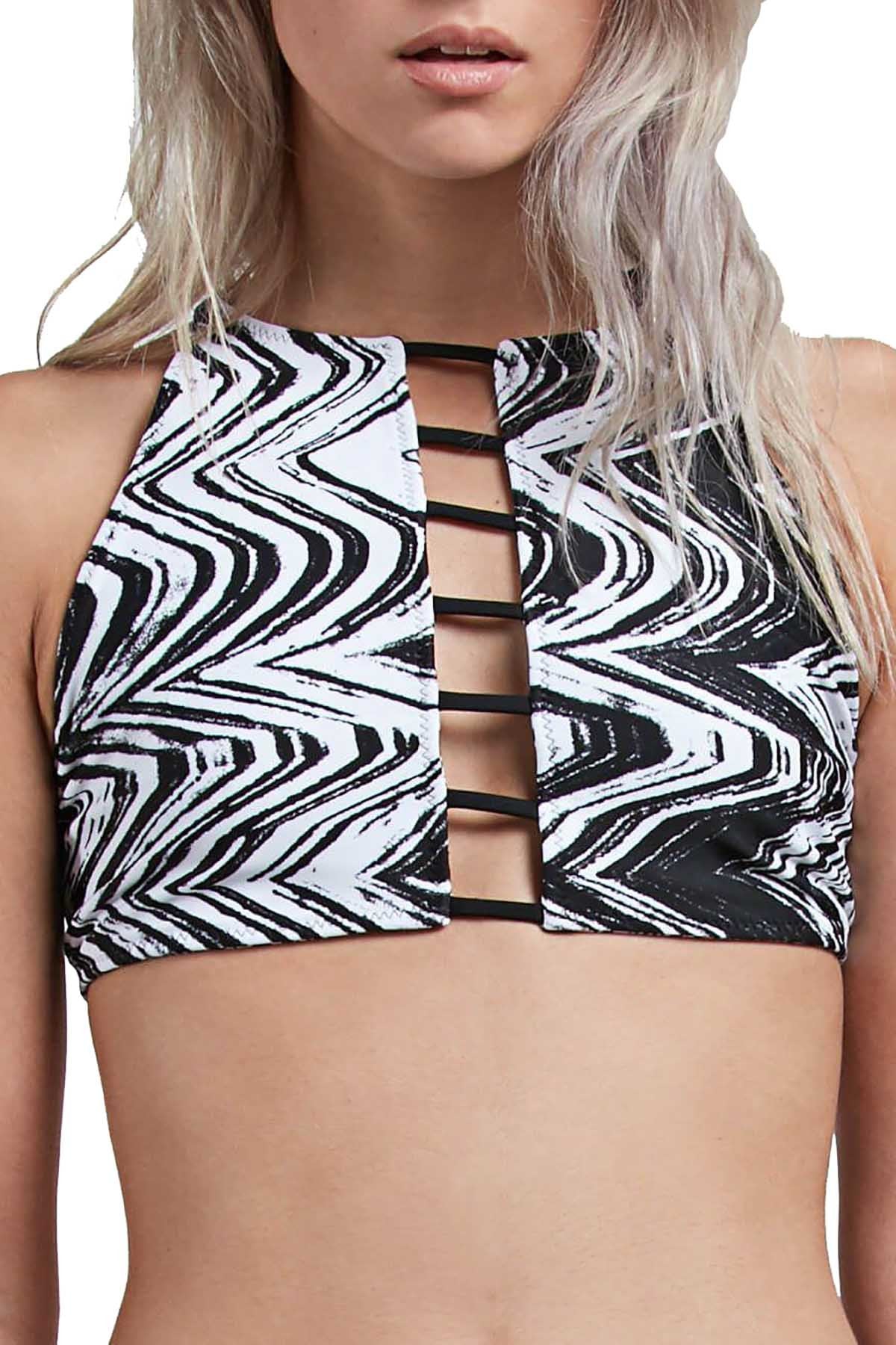 Volcom Black/White Stay Tuned Printed Reversible High Neck Crop Bikini Top